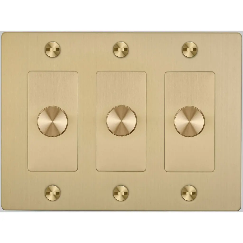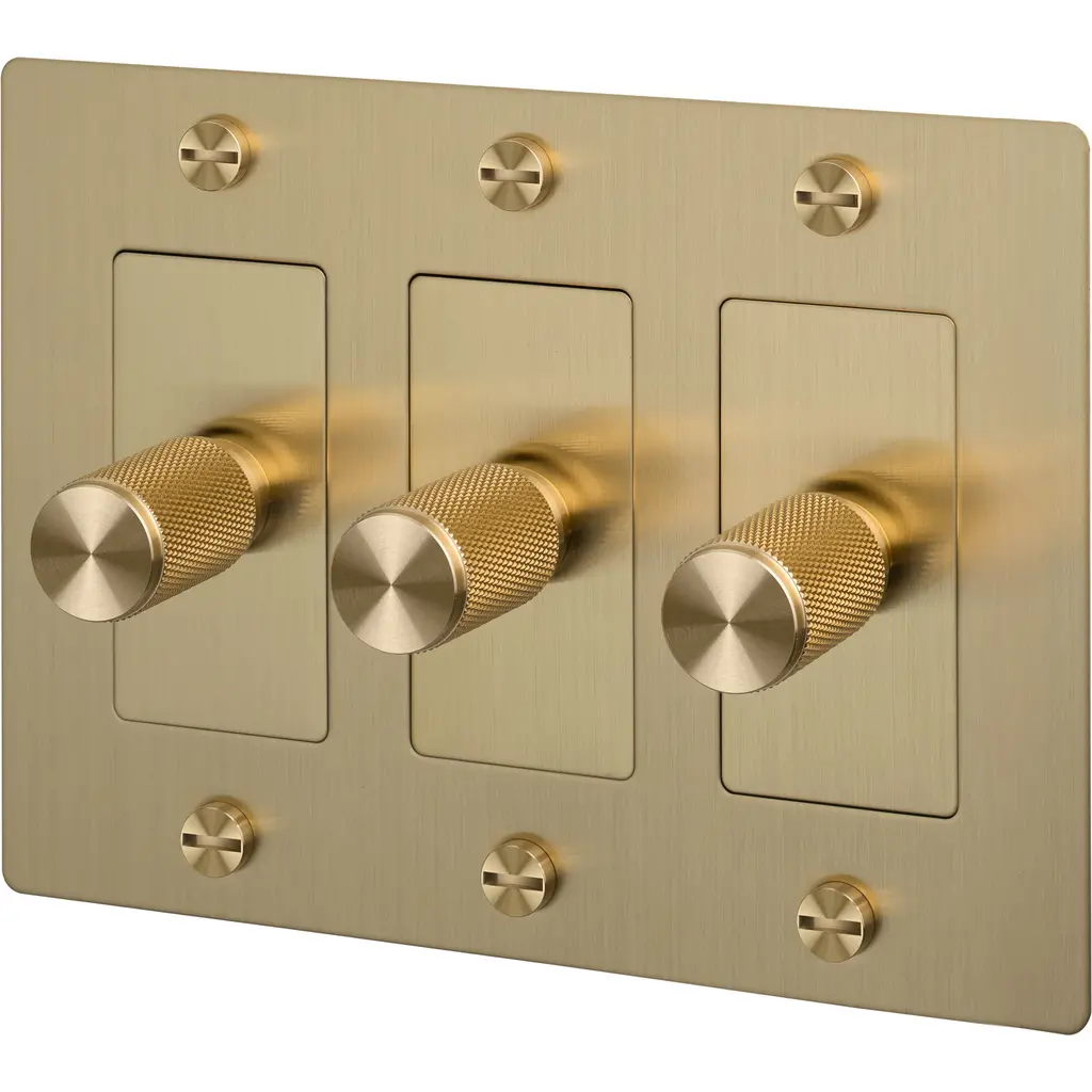 A dimmer switch finished in brass. The dimmer knob features our signature, diamond-cut, cross knurl pattern and is made from solid brass metal.FYI: This piece has a 4 mm shadow gap when installed.