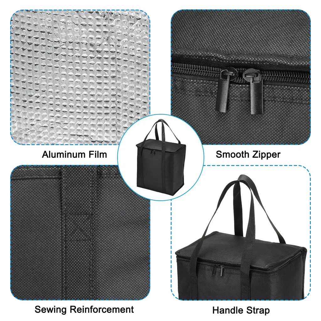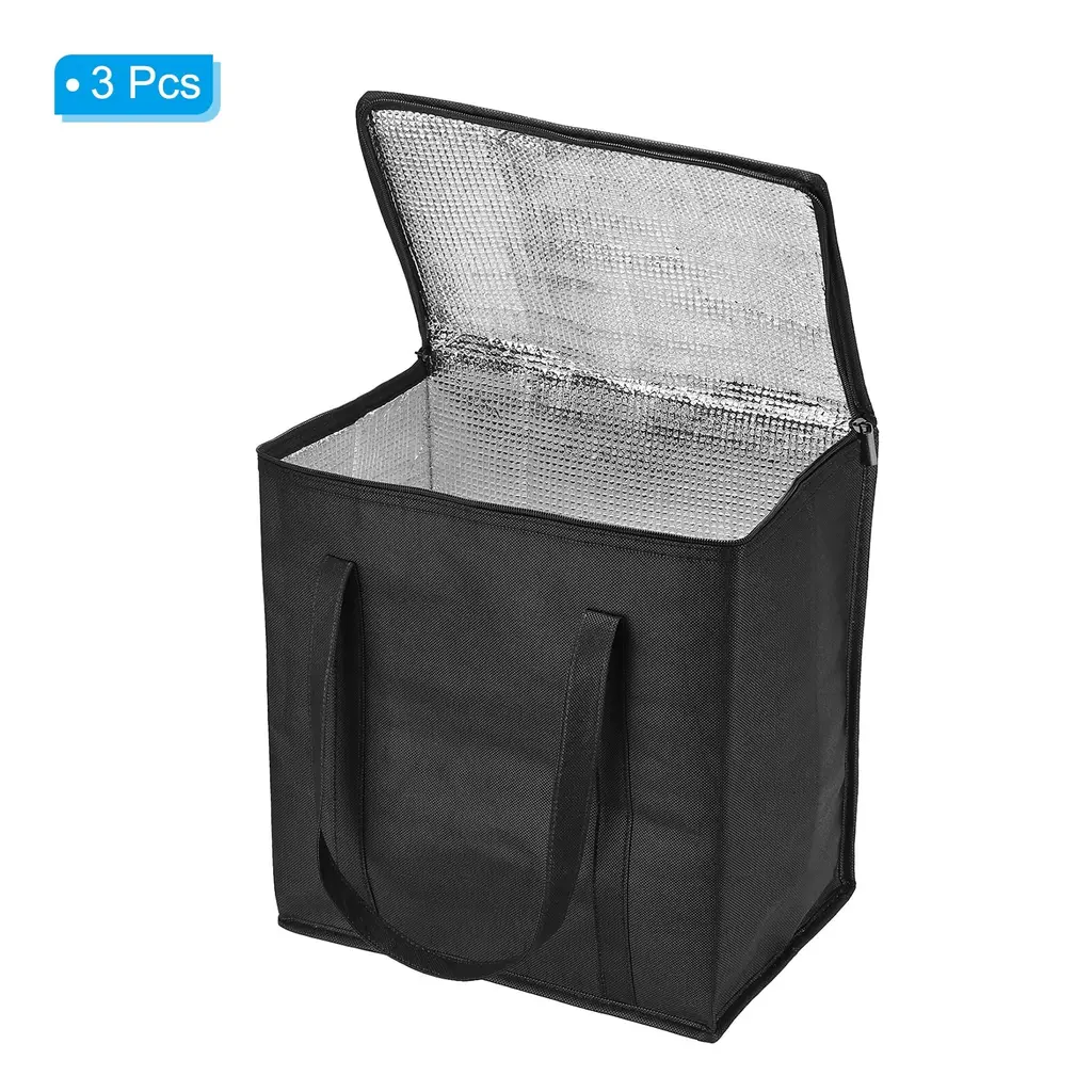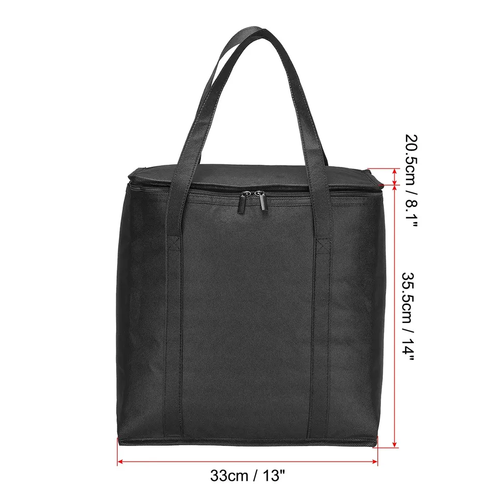 The 3Pcs 13"x8.1"x14" Insulated Reusable Grocery Bags Food Delivery Tote Bag in Black is perfect for a variety of uses such as hot and cold food delivery, grocery shopping, camping picnics, and more. With its durable non-woven fabric construction, this bag can hold a variety of foods and drinks, keeping them fresh and delicious. The interior is equipped with thermal insulation cotton and aluminum film to effectively maintain the temperature of your items. The side zipper makes it easy to access your contents, while the sturdy handle strap design allows for convenient carrying. This set includes 3 insulated grocery shopping bags in black.Features:Specification:Instruction: