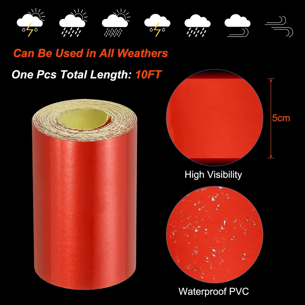 Reflector tape is widely used on driving roads, outdoors, construction site warning strips, factory equipment, different types of trailers, bicycles, backpacks, bridges, motor vehicle driving signs, parking lot down poles, truck parking spots, etc. Reflective tape can also be used to make traffic signs, advertising signs, temporary construction signs, etc.SpecificationColor: RedMaterial: PVCSize: 3 Meter x 5 cm / 10 Feet x 2 Inch (L*W)Packing List: 3 Roll x Reflector TapeAdvantageMade of PVC material, lightweight and portable, high visibility, tough, durable, waterproof, resistant to dirt, grease, rain, and sun-fading, and easy to apply.Industrial strength adhesive withstands extreme temperatures and will not damage the elements. The tape reflects light to enhance your visibility and ensure your safety in the dark, which will significantly increase visibility day and night.Instruction Warning tape is simple to operate and easy to use. First, you need to take out the reflective strip and confirm that the product is not damaged or abnormal(please make sure the tapes are dry and clean). Then peel off the protective film of the reflective strip, and then stick it according to the surface you want to stick it on.NOTE: 1. Please clean the dust and occlusion on the surface of the object before use. 2. The product itself does not emit light, it only reflects the light source. The stronger the light, the better the reflective effect.