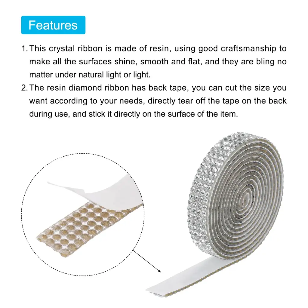 What is this?Crystal belts can mainly be used to decorate different occasions and items in your life. You can use it for decoration of furniture, cakes or handicrafts, and you can also use it for decoration on different parties, such as weddings, birthday parties, and other holidays, etc.What will I get?Color: WhiteMaterial: ResinTotal Size: 270cm x 8mm/3 Yards x 0.31 inches (L*D)In the package of: 3 Roll x Diamond RibbonAre there any advantages of the product?1. This crystal ribbon is made of resin, using good craftsmanship to make all the surfaces shine, smooth and flat, and they are bling no matter under natural light or light.2. The resin diamond ribbon has a double-sided tape, you can cut the size you want according to your needs, directly tear off the tape on the back during use, and stick it directly on the surface of the item.How to use it?You just need to cut the diamond ribbon to the length you need and use it to diy your items.What should I notice?Within 48 hours of use, do not let the craft come into contact with liquids