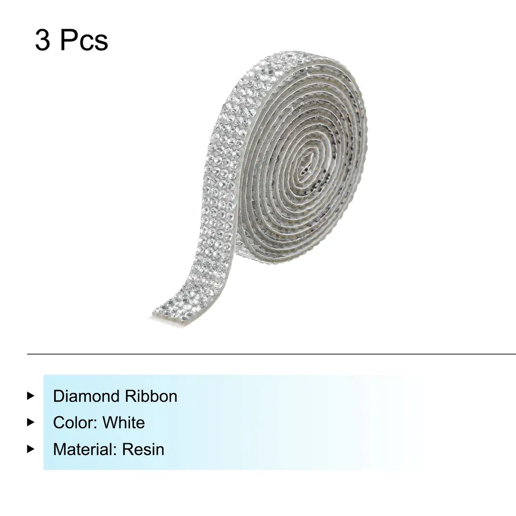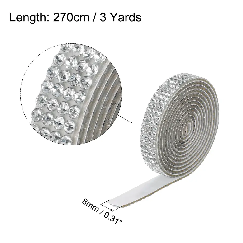 What is this?Crystal belts can mainly be used to decorate different occasions and items in your life. You can use it for decoration of furniture, cakes or handicrafts, and you can also use it for decoration on different parties, such as weddings, birthday parties, and other holidays, etc.What will I get?Color: WhiteMaterial: ResinTotal Size: 270cm x 8mm/3 Yards x 0.31 inches (L*D)In the package of: 3 Roll x Diamond RibbonAre there any advantages of the product?1. This crystal ribbon is made of resin, using good craftsmanship to make all the surfaces shine, smooth and flat, and they are bling no matter under natural light or light.2. The resin diamond ribbon has a double-sided tape, you can cut the size you want according to your needs, directly tear off the tape on the back during use, and stick it directly on the surface of the item.How to use it?You just need to cut the diamond ribbon to the length you need and use it to diy your items.What should I notice?Within 48 hours of use, do not let the craft come into contact with liquids