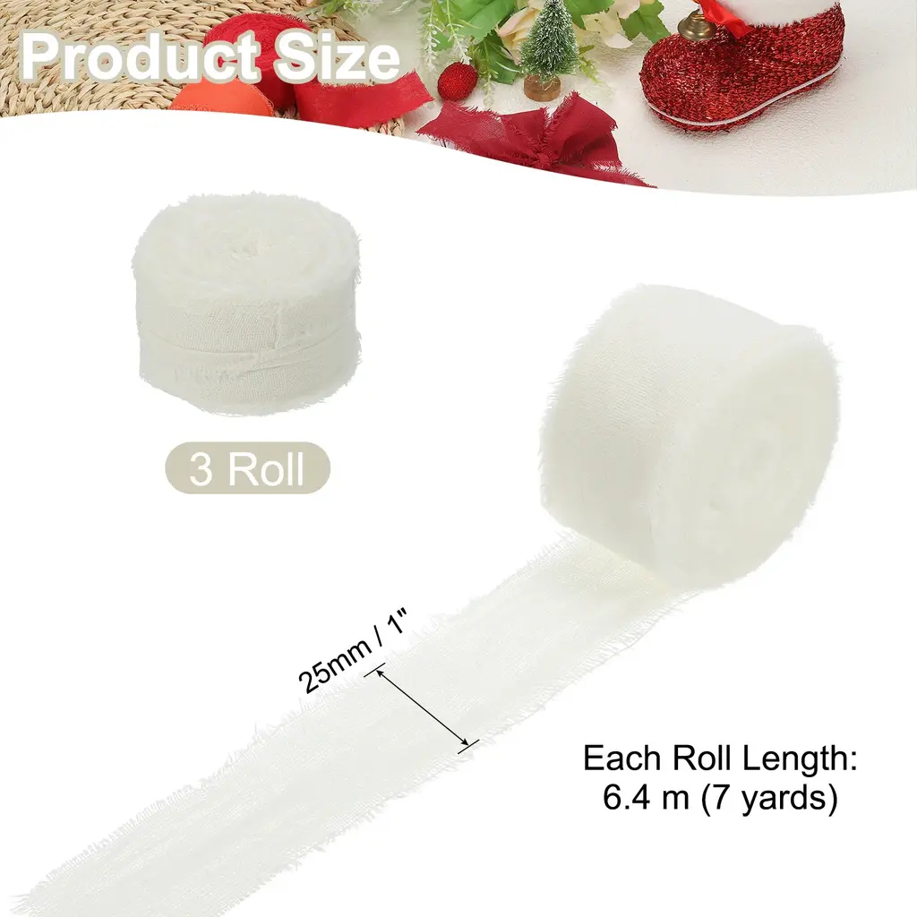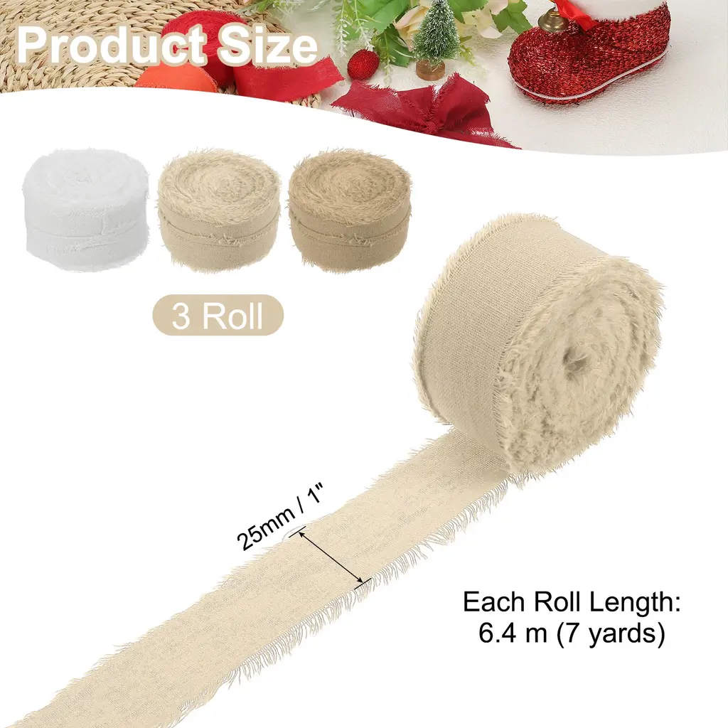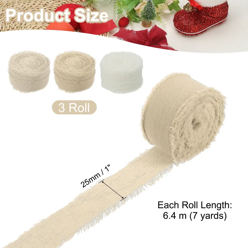 Cotton handmade fringe ribbon is a unique cotton decorative ribbon with delicate tassel decoration on the edge, which enhances the beauty and texture of various projects. Suitable for gift wrapping, flower arranging, scrapbooking, home decoration, clothing decoration, cards, wedding invitations, bridal bouquets, holiday party decorations, and DIY creations, etc.SpecificationColor: BeigeMaterial: 100% CottonWidth: 2.5 cm / 1 inchLength (Each Roll): 6.4 m / 7 yardsPacking List: 3Roll x Handmade Fringe Cotton RibbonAdvantageNATURAL MATERIAL: Made from cotton, this ribbon has a soft and natural texture, adding comfort and rustic charm to a variety of projects.FRINGE DESIGN: The handcrafted tassel detail provides a unique decorative touch that enhances the visual appeal of your piece.InstructionCut it to any length you want and secure the ribbon to your project by sewing, gluing, or tying.NOTE: Due to differences in natural light and display resolution, the color of the item shown in the photo may be slightly different from the actual item.