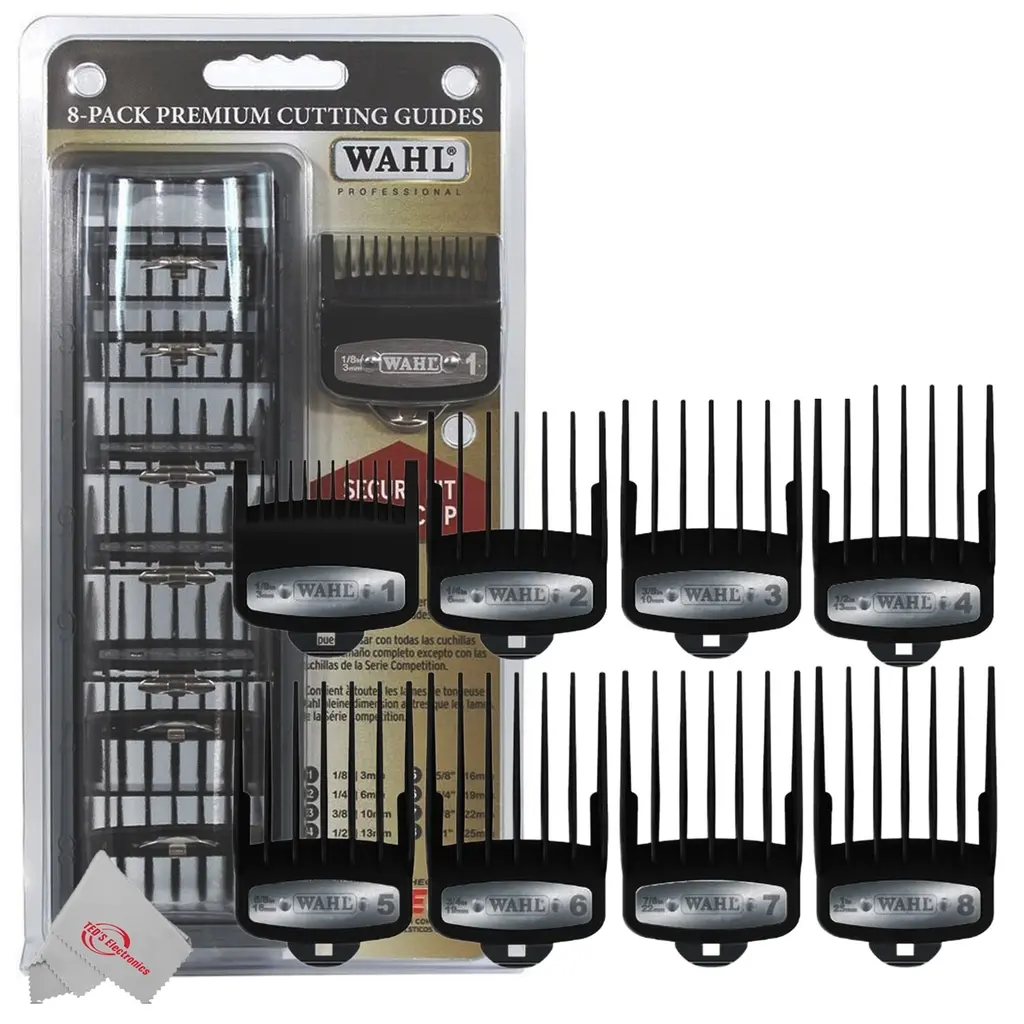 3X WAHL 8 PACK PREMIUM CUTTING GUIDES FITS ALL WAHL FULL SIZE CLIPPER BLADES (EXECPT COMPETITION SERIES) Wahl Pro 8 Pack Cutting Guides Metal Clips with Free Organizer Tray 8-Pack Premium Cutting Guides Secure Fit Metal ClipMetal clip ensures combs' lasting fit to blade.Glass and mineral filled plastic seamless glides through hair for smoother cutting experience.Rounded comb teeth provide more pleasant cutting experience to clientele.Maintain precision lengthsFits all Wahl full - size clippers (except Competition series)Organizing tray measures 8" long, 2 3/4" wide and 3 3/4" high Model: 3171-500 This Kit From Teds Electronics Includes: 3x Wahl 8-Pack Premium Cutting Guides Fits All Wahl Full Size Clipper Blades (Except Competition Series) MPN: 3171-500-3x UPC:043917100371