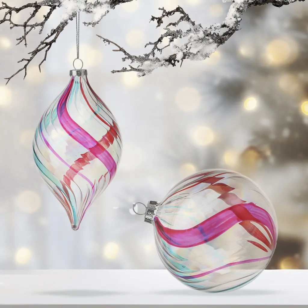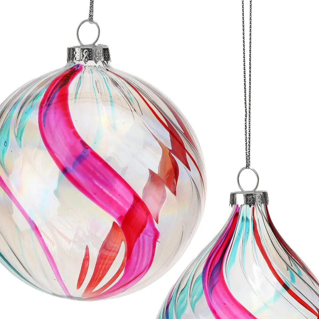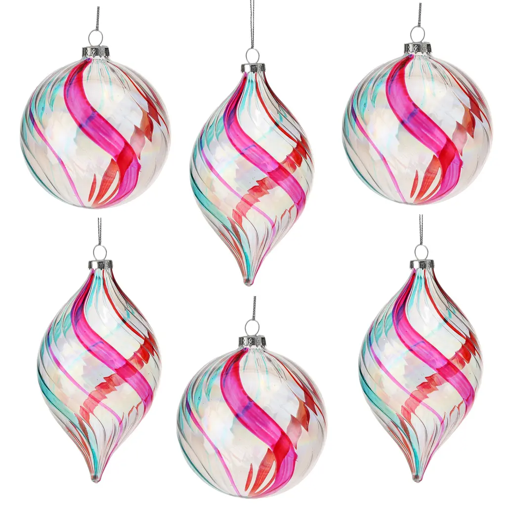 Add whimsy and charm to your holiday décor with a 4-5.5" Clear Glass Swirl Retro Finial Set of 6. Crafted with exquisite attention to detail, these finials feature a classic textured swirl design in hues of pink, blue, and red and an iridescent sheen that evokes a sense of timeless elegance. Made from high-quality clear glass, and silver string, this design effortlessly compliments any tree, wreath, or garland.
