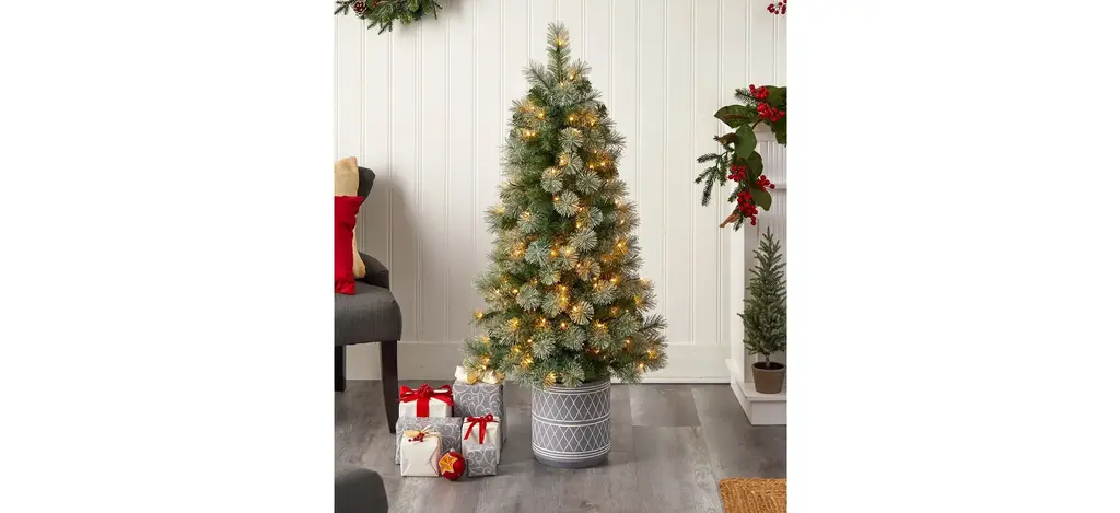 4.5' Pine Artificial Christmas Tree In Planter With Bendable Branches And Warm White Led Lights