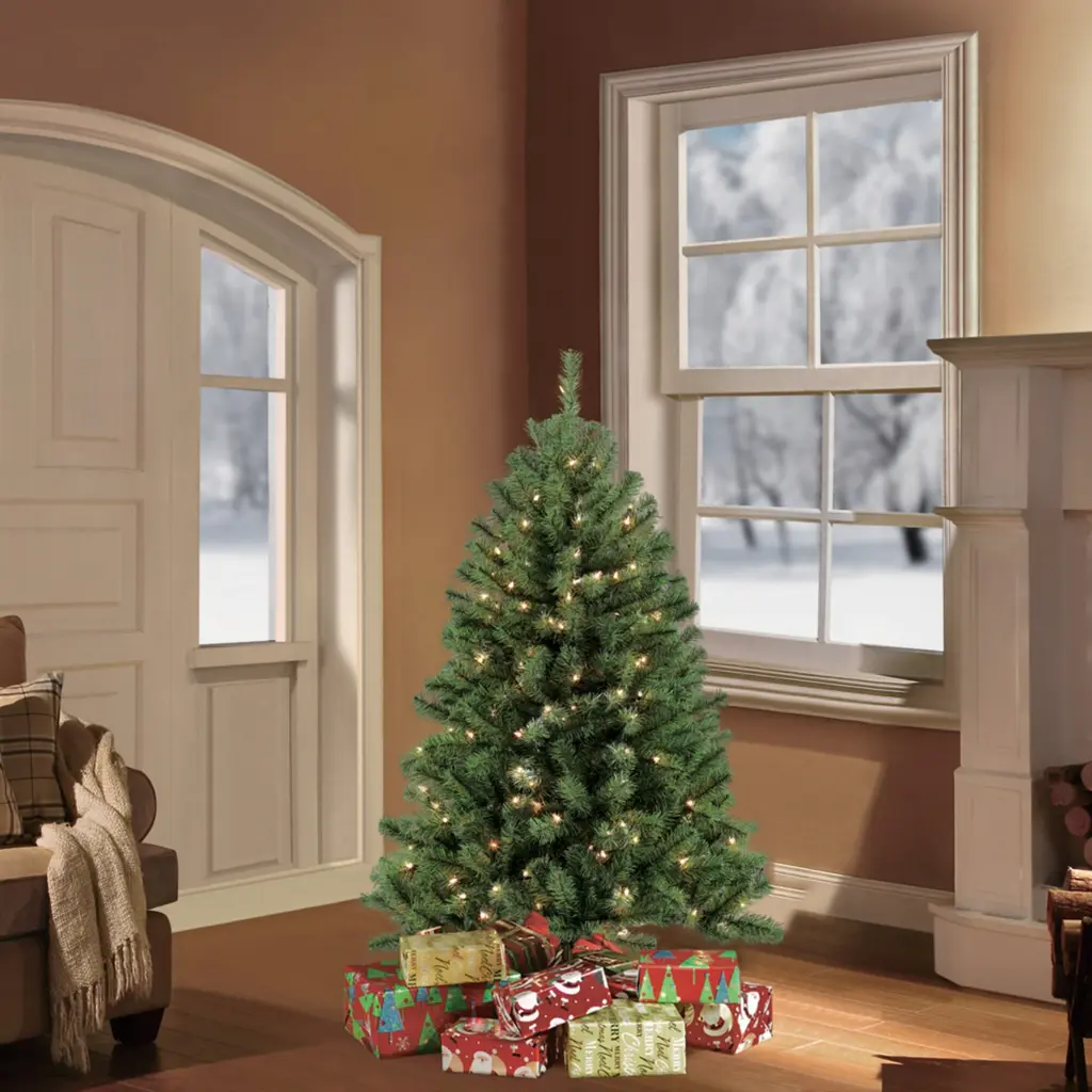 Bring festive cheer to your home this holiday season with this stunning pre-lit Christmas tree. Featuring 200 clear incandescent mini lights and 472 tips, this full-profile tree offers a timeless and enchanting glow that will light up any room. Designed for indoor use, this tree is equipped with UL-listed lights that will stay lit even if one bulb burns out. Product Features: Pre-lit with 200 clear lights Bulb size: mini Bulb type: incandescent 472 tips Additional Product Features: Full profile tree Hinged branch construction UL-certified and approved For indoor use only If one bulb burns out, the rest will stay lit Lights are equipped with a lamp lock feature, which makes them replaceable, and interchangeable and keeps them from falling out 3-piece easy assembly (including stand) Comes with replacement bulbs and spare fuses Comes with a FREE black metal tree stand Dimensions: 4.5' high (from the base of the stand to the top of the tree) 36" base diameter (at the widest point) Material(s): PVC/metal/glass bulbs/wire Note: Branches are compressed for shipment, and need to be fluffed out upon arrival to look like the photo.