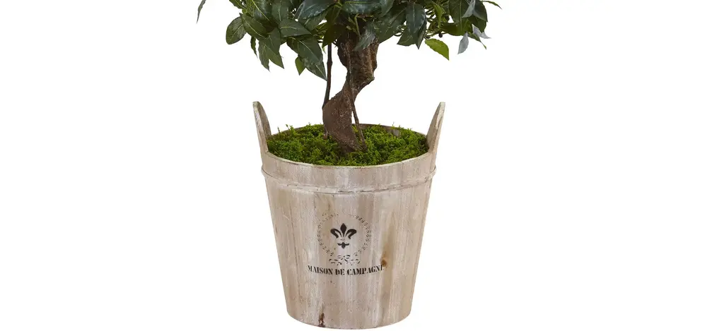 This unique 4 1/2ft Sweet Bay Double Topiary Artificial Tree in Farmhouse Planter lends a inspired touch to any room. It's gnarly trunks are incredibly realistic in their detail. Perfect for an artist's studio or anywhere a crafty decorative accent is needed. Comes in a whimsical barrel planter made of real wood with natural moss.