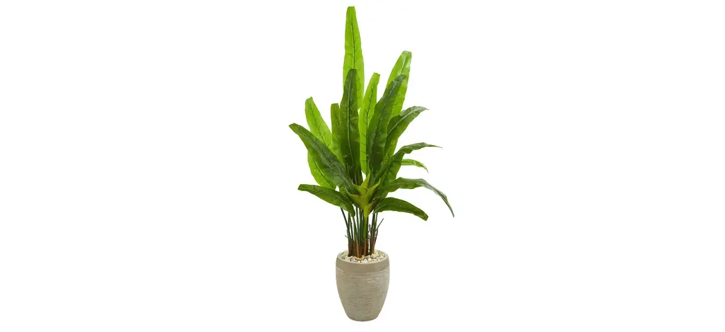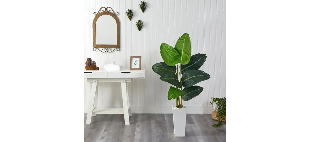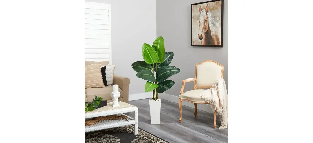 Bring some color to spaces that need more depth with this Travelers Palm Artificial Tree in White Planter. Variegated palm fronds with dark and light hues contrast each other in a drape-like way from lifelike stems with naturally occurring details. Standing 4.5' from a white planter (included in height), with river rocks, add to spaces that need a focal point. Curate in your office, living rooms, foyer, or bedroom.