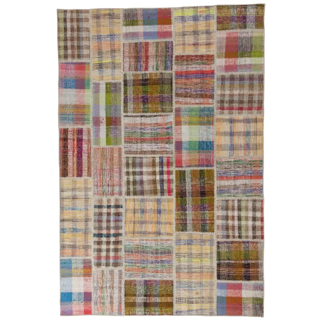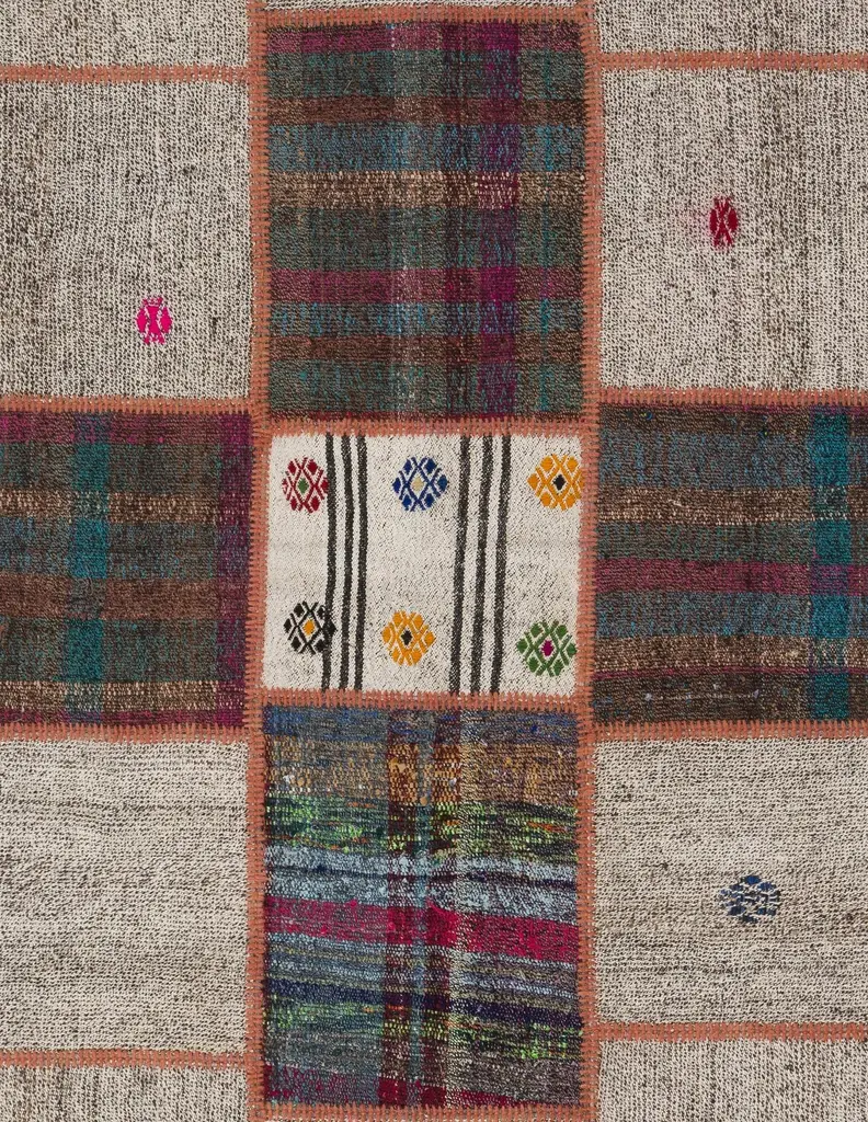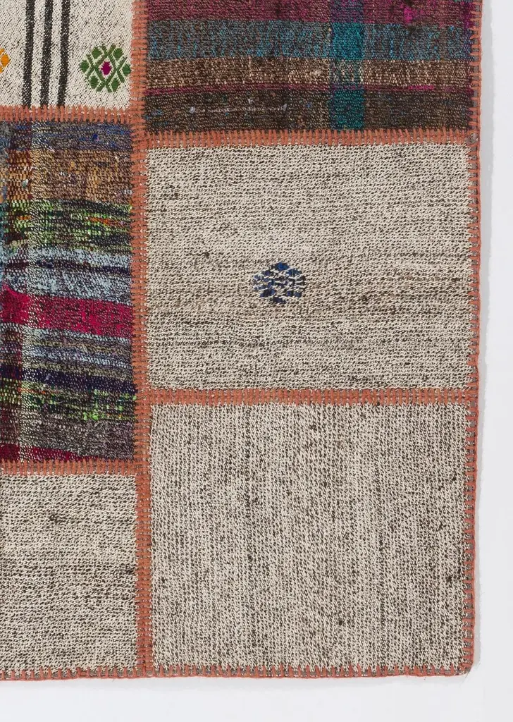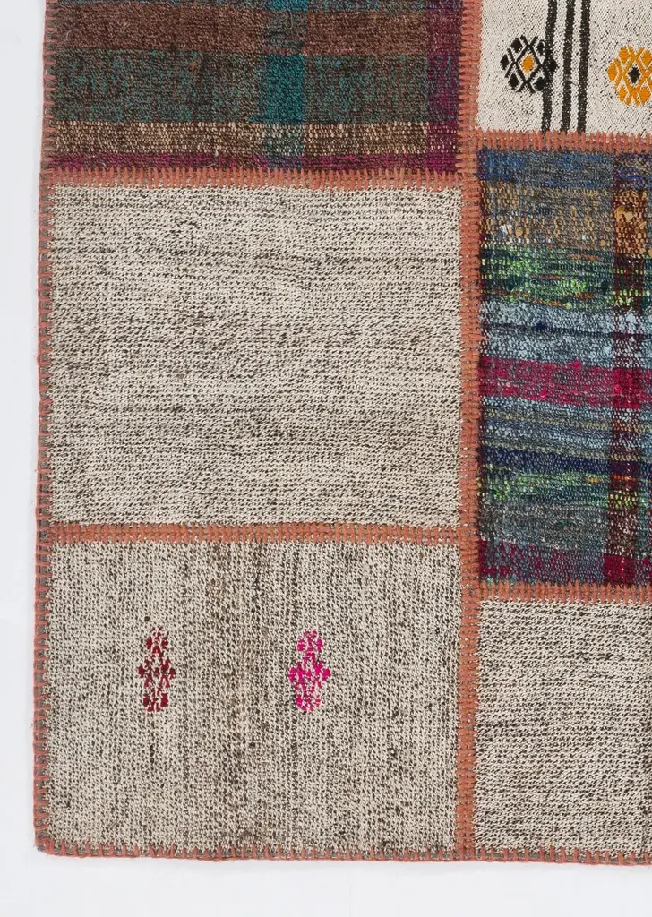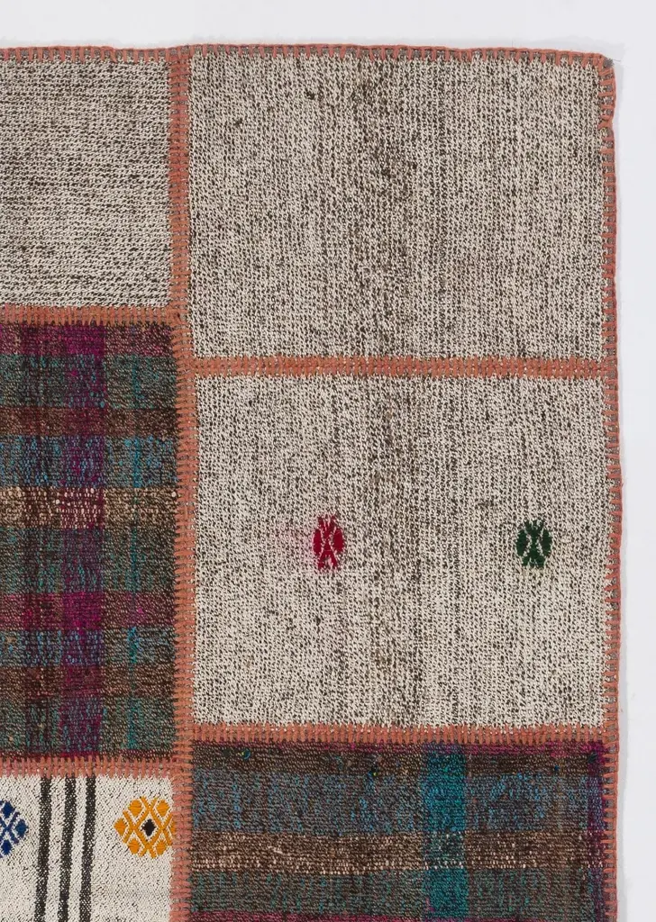 This floor covering is made of pieces of assorted vintage handmade Anatolian kilims. Made of wool and cotton. There is a durable cotton twill sewn on the back as an underlay and for a smooth finishing. Measures: 4.5 x 6.3 ft.