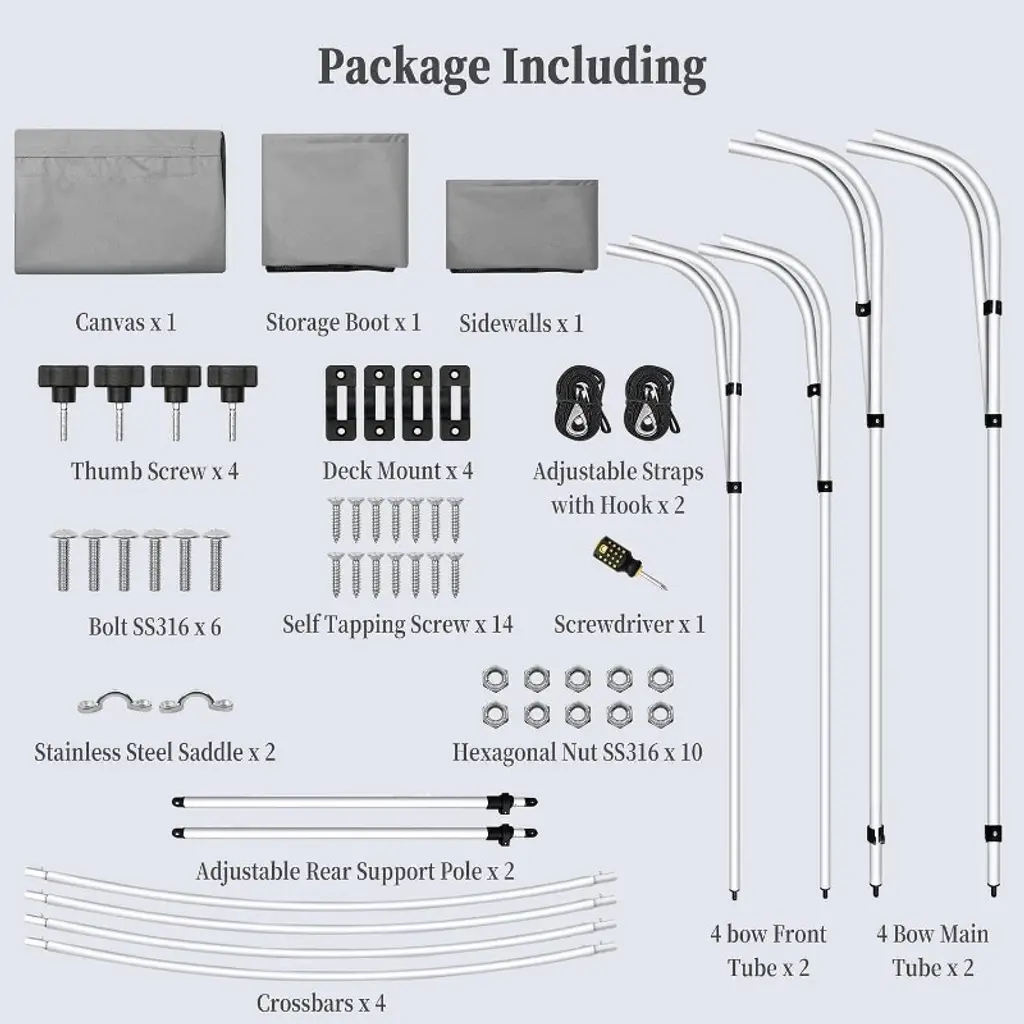 【Marine-Grade Protection】 Crafted from high-quality 600D marine-grade fabric with a robust 1200mm PU coating, this Bimini top ensures your boat is shielded from harsh weather and UV rays. The detachable sidewalls feature zippers, allowing for coverage that adapts to your boating needs, whether you want full protection or a breezy open feel. 【Sturdy Yet Lightweight Frame】 Designed for maximum resilience, the Bimini Top features a lightweight 1" aluminum alloy frame with a thickness of 1.5mm. This heavy-duty construction not only provides exceptional strength but also makes installation and removal a breeze, ensuring your boat cover remains secure even in rough waters. 【Versatile Adjustable Support】 Equipped with two adjustable rear support poles, this Bimini top allows you to easily modify the angle and area of shade according to your preference. When not in use, simply fold the poles down for compact storage, making it a practical choice for any boating adventure. 【Comprehensive Accessory Package】 The Bimini Top comes complete with essential accessories, including two windproof straps and a zippered storage boot. This package simplifies installation, ensuring you have everything you need to set up your boat cover quickly and efficiently, enhancing your time on the water. 【Dedicated Customer Care】 At our company, we prioritize your satisfaction. Our responsive customer support team is ready to assist you with any inquiries or concerns, whether pre-sale or post-sale. For personalized assistance in choosing the right size for your boat, don’t hesitate to reach out—we're here to help you enjoy your boating experience fully.