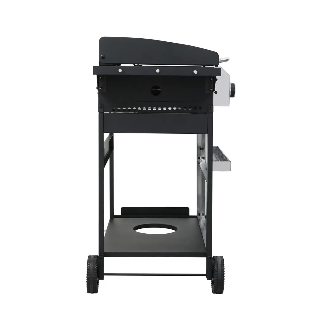 【Firebox】: Enamel【wheel】: 2pcs 6inch wheels【wire enamel cooking grids】: 2pcs 11.6x17.3 inch【Warming rack】: Enamel【Ignition system】: Push and turn, integrated automatic easy ignition【Flame tamper】: Enamel flame tamper, 4pcs【Power】: 12300 BTU * 4= 49200 BTU【Hanging baskets】: 22.2x3.15x1.57inch【Side table】: Steel, black powder coating, foldable, 11x17.7inch【Hooks】:6pcs