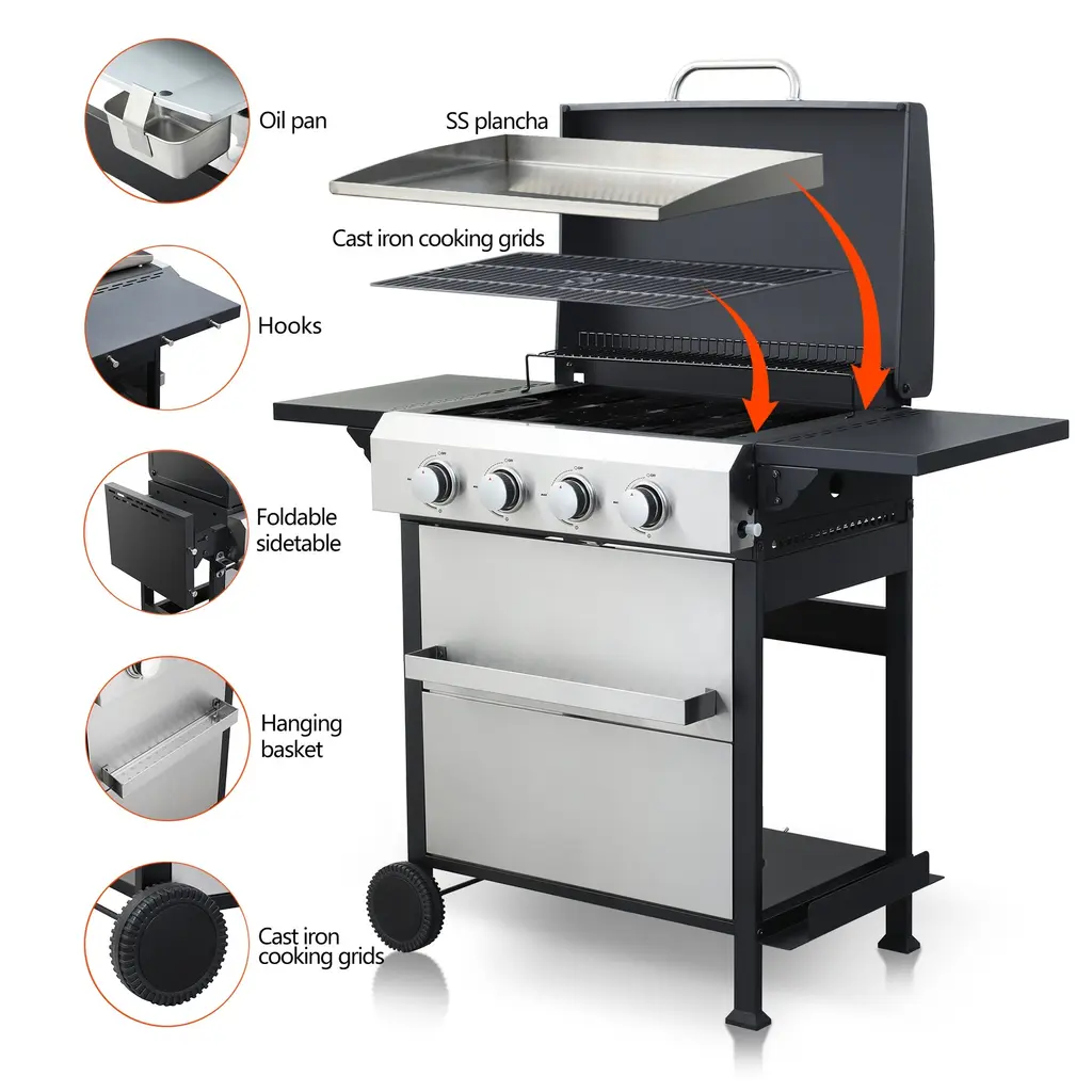 4-Burner Propane Gas Bbq Grill, Ss Plancha, 49200btu Output With Wire Enamel Cooking Grids For Outdoor ,Stainless Steel - Black