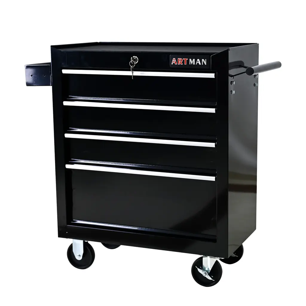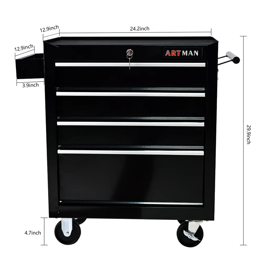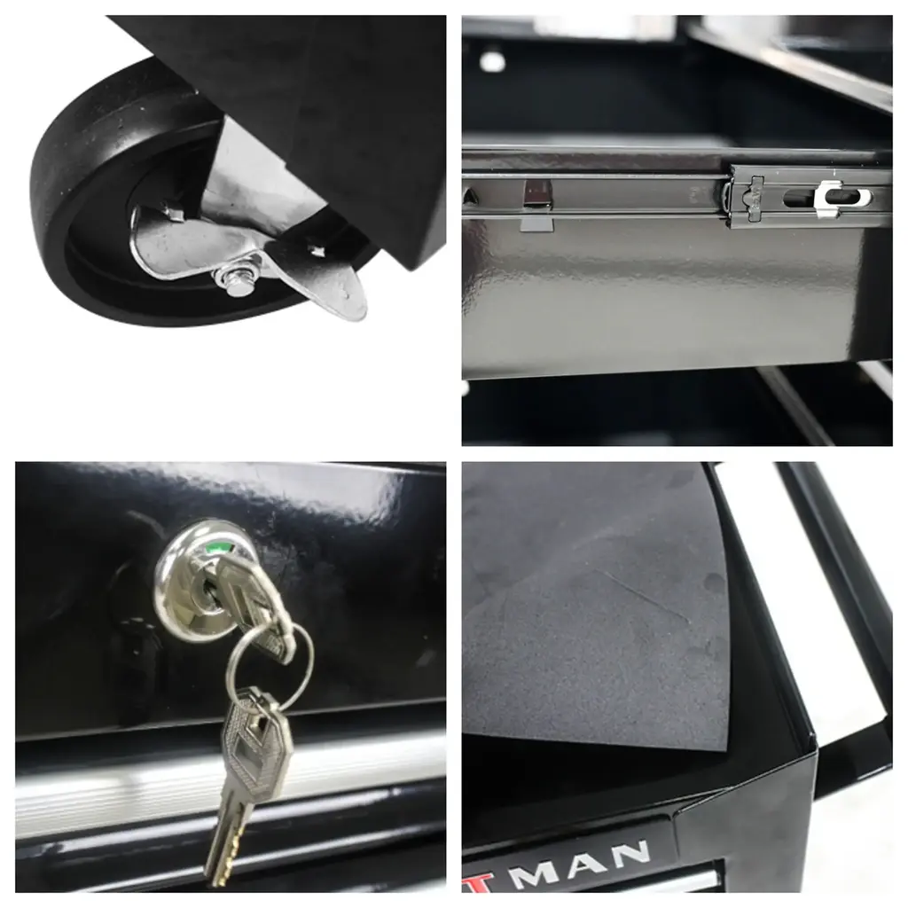 Product Features4 Drawers moultifunctional tool cart with wheelsThe tool box is also lockable and can be used as a removable, attachable and mobile caseThe opening and closing of the drawers of the tool cabinet is very gentle thanks to the ball-bearing drawersThe robust and powder-coated steel construction is used for high wear resistance. This assembly trolley has 4 steering wheels, 2 of which with parking brakes, so you can move the trolley freely in the garage, but also stop in one placeDescriptionTop&Drawer LinerProtect your tools scratchesBall-Bearing Drawer SlidesPull or push the drawer easily and smothlyKey Locked DrawersWith keyed locking system(2 keys in included)Flour Universal Wheels,Two BrakesMove easily anywhere and stop quickly with 2 lockable wheelsProduct InformationProudct Name 4 Drawers Workshop Tool TrolleyMaterial Cold Rolled SteelSurface Finish Powder CoatingPowder Coating:4" Casters (2PCS with brake and 2PCS without brake)Size:Please refer to the picture3 Drawers Dimension:Please refer to the picture1 Drawers Dimension:Please refer to the picturePackage Size: 26.37*14.76*27.95Color:BlackGross Weight:57.09