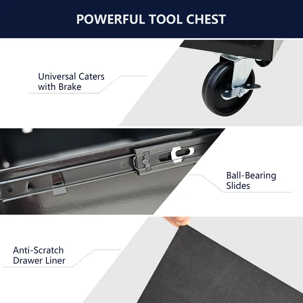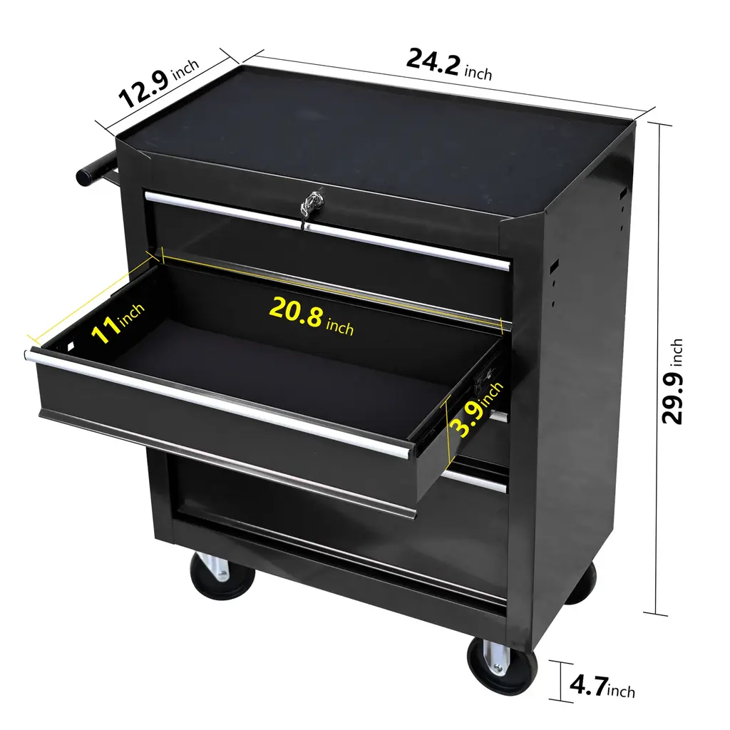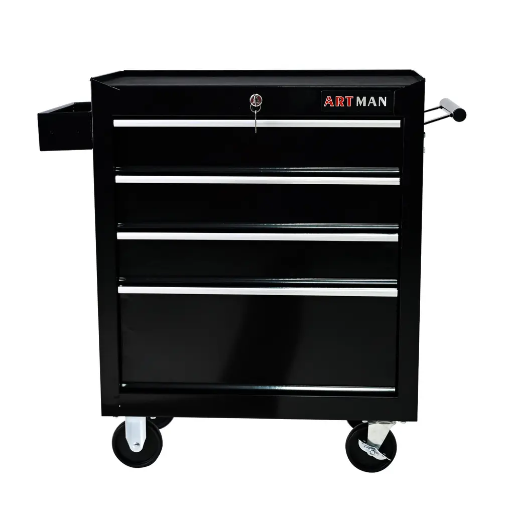 Product Features4 Drawers moultifunctional tool cart with wheelsThe tool box is also lockable and can be used as a removable, attachable and mobile caseThe opening and closing of the drawers of the tool cabinet is very gentle thanks to the ball-bearing drawersThe robust and powder-coated steel construction is used for high wear resistance. This assembly trolley has 4 steering wheels, 2 of which with parking brakes, so you can move the trolley freely in the garage, but also stop in one placeDescriptionTop&Drawer LinerProtect your tools scratchesBall-Bearing Drawer SlidesPull or push the drawer easily and smothlyKey Locked DrawersWith keyed locking system(2 keys in included)Flour Universal Wheels,Two BrakesMove easily anywhere and stop quickly with 2 lockable wheelsProduct InformationProudct Name 4 Drawers Workshop Tool TrolleyMaterial Cold Rolled SteelSurface Finish Powder CoatingPowder Coating:4" Casters (2PCS with brake and 2PCS without brake)Size:Please refer to the picture3 Drawers Dimension:Please refer to the picture1 Drawers Dimension:Please refer to the picturePackage Size: 26.37*14.76*27.95Color:BlackGross Weight:57.09
