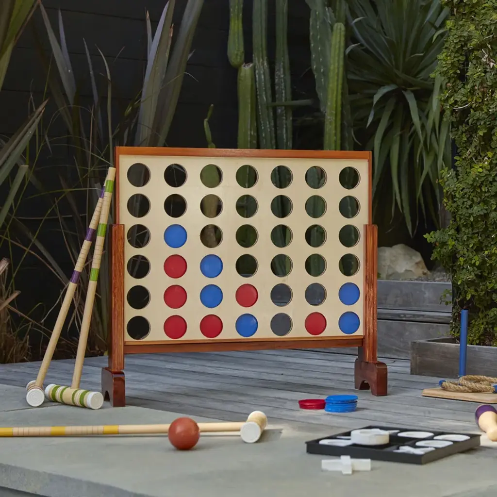 Get ready for big-time fun! This Giant Four in a Row game takes a classic strategy game to a larger-than-life scale. Crafted from solid wood and plastic, it's built to withstand the elements and keep the good times rolling. Ideal for two players, this game is perfect for outdoor gatherings or indoor game nights.