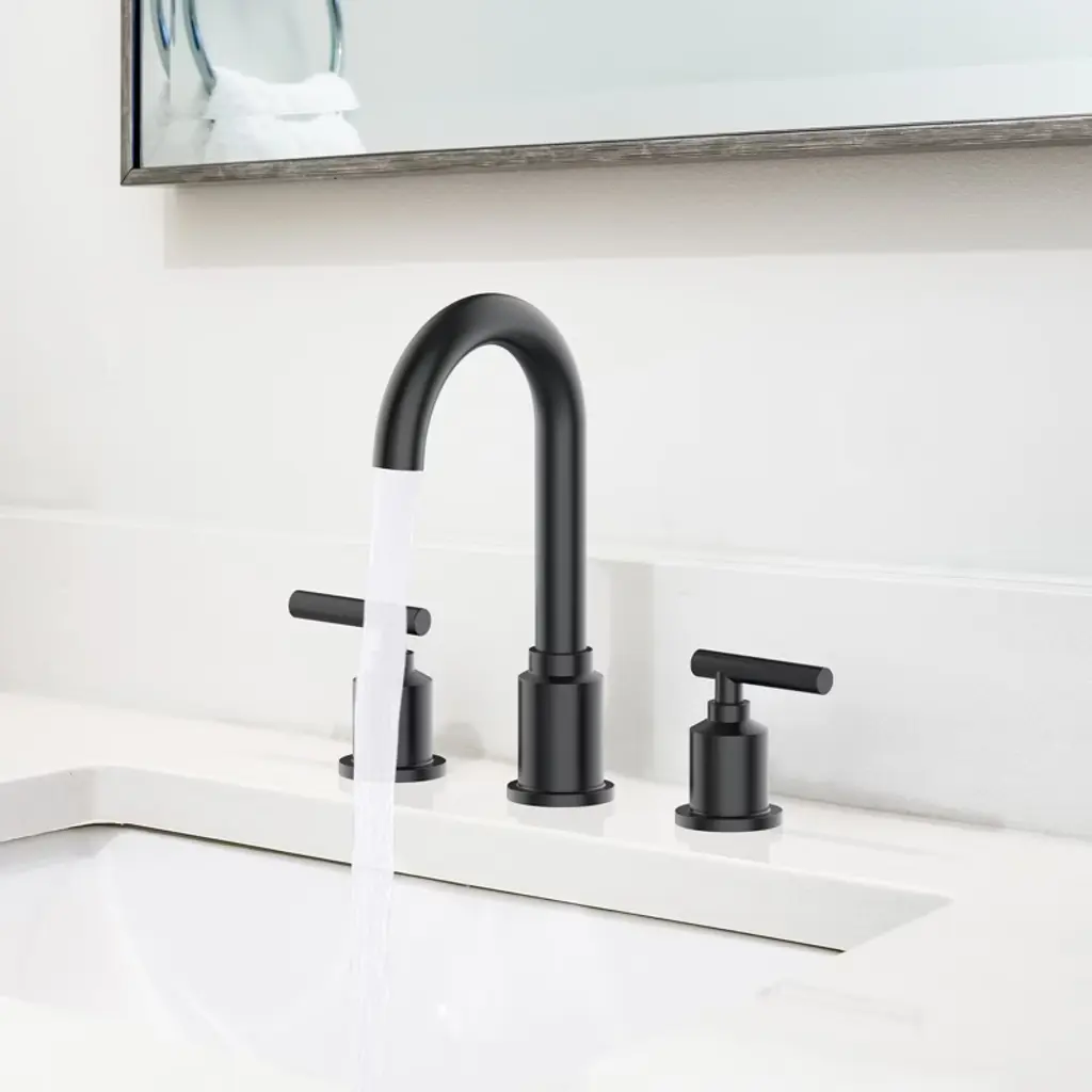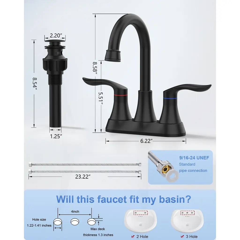 Product Features【 PREMIUM MATERIAL & DESIGN 】- Exquisite faucet for bathroom sink, anti-scratch, resist rust, corrosion and tarnish, no water spot and finger print. Hidden bottom floor design : No prominent; Betterwater proof ( Prevent residual water rust Internal parts ) Exceed industry longevity standards, ensuring durable performance for life. Flow Rate: 1.2GPM 4.46L/min.【 TWO-HANDLE METAL LEVER 】- Two handle lever bathroom faucet design for precise control in both volume and water temperature. The handle torque can reach up to 18MM, which greatly extends the handle life.(The current industry standard is 9MM). The high-quality ceramic & copper cartridge has passed 500,000 cycles of water tightness test to ensure that the brushed matt black bathroom faucet is stable.【 WATER EFFICIENT 】- The ABS aerator of 3-hole mount 4 inch centerset bathroom sink faucet imported strengthens the foaming effect of the dense, the water flow is dense and soft without splashing,improve water efficient. Detachable aerator, you can clear hard water blockage at any time. Suitable for rent house, new condo, single-apartment, motor home, travel trailer and family use.【 EASY TO INSTALL 】- Lavatory faucet design can help you install by following the instruction with 30mins, without a plumber and save the fee. The box contains all you need (including pop up drain and Braided Stainless Steel Water Inlet Hose 9/16"Female Compression Thread x 1/2"Female Compression Thread, x 2 Pcs (1 Pair). Unique fast connect construction, the hot and cold water can be mixed by quick-install pipe without wrench, through technique to prevent pipe burst.DescriptionRecommended Uses For Product BathroomMounting Type:Deck MountFinish Type:BrushedColor:Matte BlackNumber of Handles:2Included:Components faucet, pop up drain, water hose, manualHole Count:3Special Feature Water Saving System, 360 Swivel, Pop Up Drain, Lead FreeHandle Type:LeverStyle:ModernInstallation Type:CentersetMaximum Flow Rate:1.2 Gallons Per MinuteHandle Material:ZincSpout Height:5.42 InchesSpout Reach:5.4 InchesSpout Design:High ArcHose Length:23.62 InchesIs Electric:NoItem Weight:2.44 poundsProduct Dimensions:14.3 x 10.2 x 2.7 inchesSize Centerset:4Finish:BrushedSpecial Features:Water Saving System, 360 Swivel, Pop Up Drain, Lead FreeBatteries Included? NoBatteries Required? No