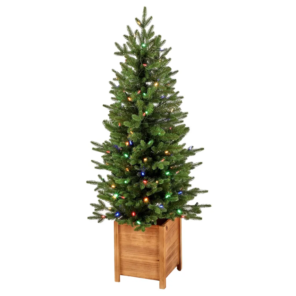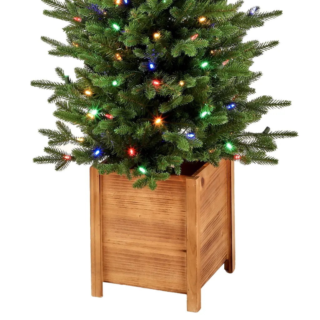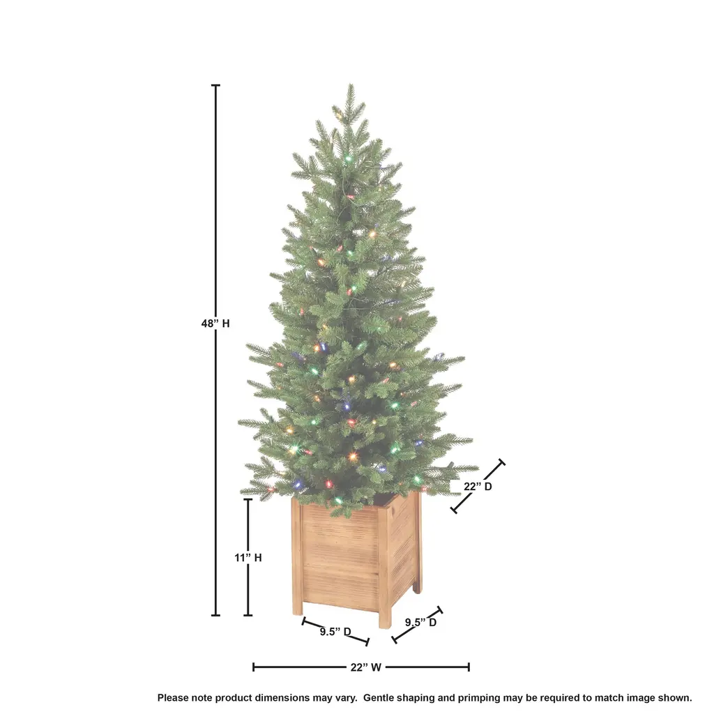 Add a charming 4' LED potted Ornamental Pine Tree to your home this holiday. This tree is sure to be a delight with 235 branch tips meticulously crafted to mimic the lush foliage of a real pine tree, this lifelike decoration brings the charm of the outdoors inside. Adorned with 150 warm LED white lights, it radiates a cozy glow that instantly enhances any corner of your home or office. Situated in an adorable wood pot, boasting a diameter of 28 inches, this tree is the perfect size to grace your entryway, living room, or patio. Its durable potted design ensures stability, allowing you to display it with confidence year after year. Intended for decorative use. Enjoy the beauty of nature wherever you go!
