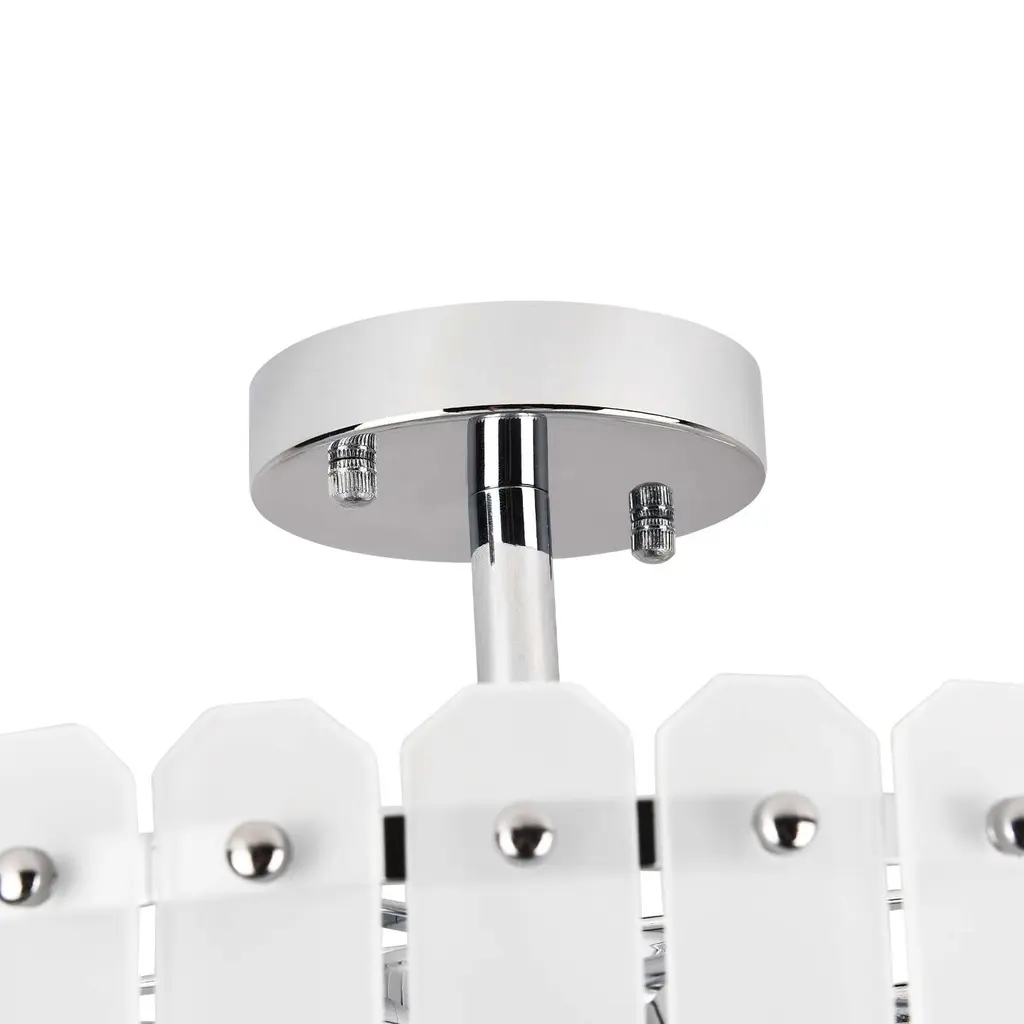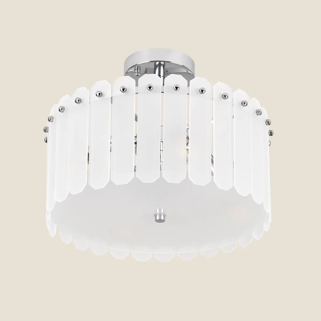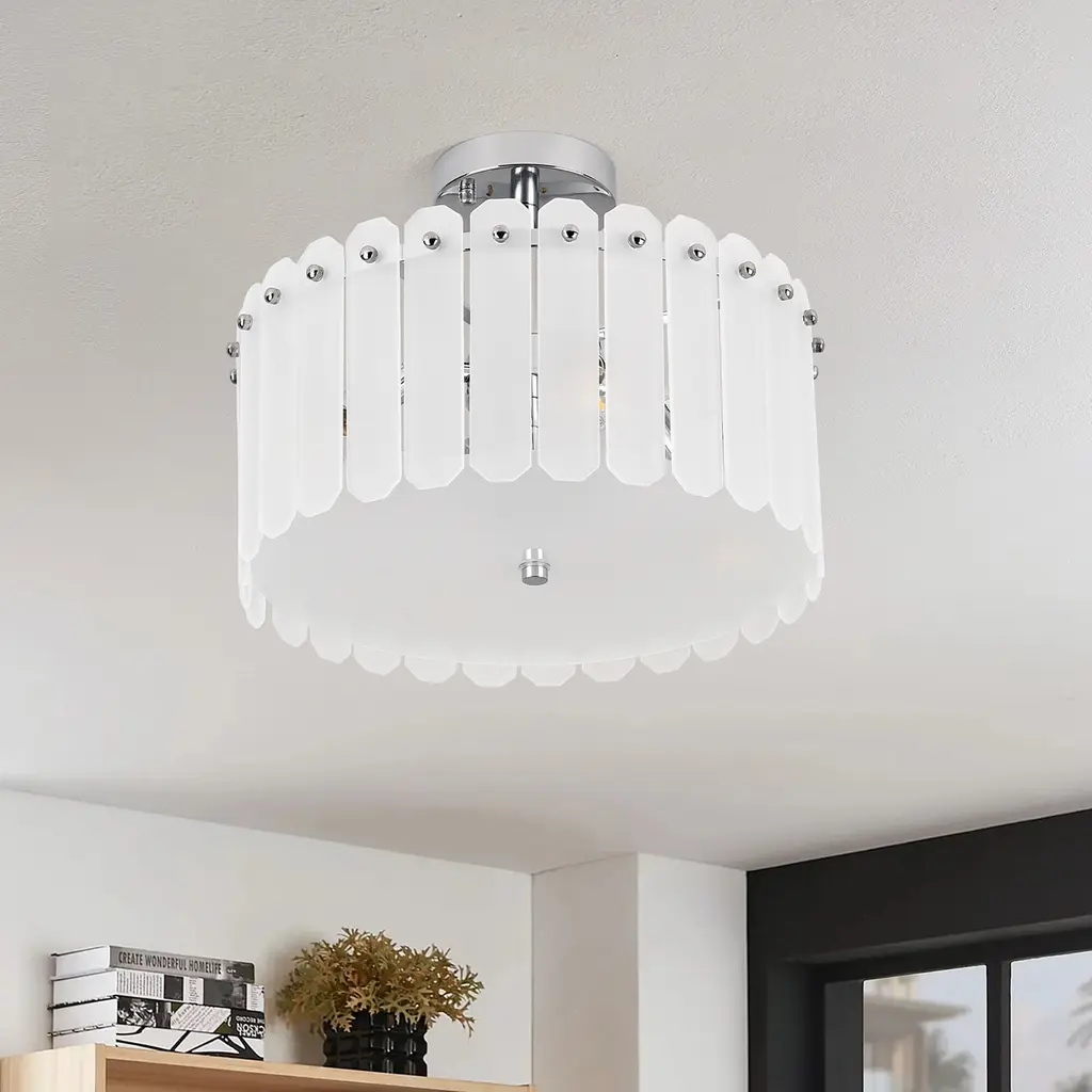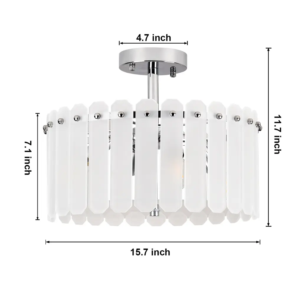 Detail:Add a touch of modern sophistication to your space with this elegant 4-light flush mount fixture. Featuring a sleek chrome finish and a unique frosted acrylic shade design, this light offers both contemporary style and soft, diffused illumination. Perfect for living rooms, dining areas, or bedrooms, its drum silhouette blends seamlessly with various decor styles. The fixture accommodates 4 E12 base bulbs (not included), ensuring ample lighting for your home while enhancing its ambiance. Durable, easy to install, and visually striking, this ceiling light transforms any room into a refined retreat.Features:Dimensions:Product Care:Cleaning: Avoid using chemical cleaners, solvents or abrasive materials. Use a dry, soft cloth to wipe away dust. For a more thorough cleaning, turn off the circuit breaker and disconnect the power supply. Then gently wipe the exterior of the fixture with a dry or slightly damp, clean cloth.Country of Origin: China