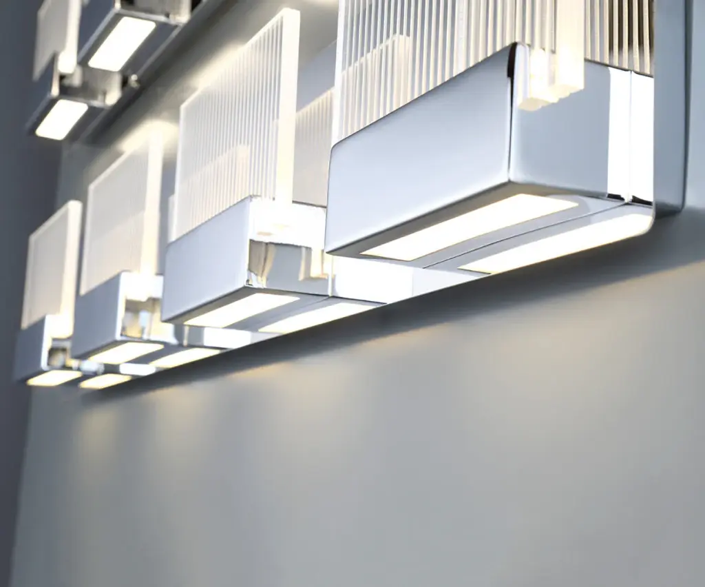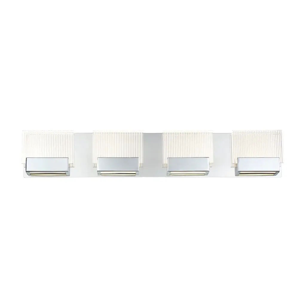 Sonic Striated Etched Glass 4 LED Bath Bar Chrome Finish 29.5 Inches WidePower: HardwireRating: cETL DampLamping: 4x 6W Integrated LEDBulb(s) Included. glass gives the four bathbar a contemporary look. The is patterned with both clear and etched placed on chrome frame body. This helps to diffuse light.