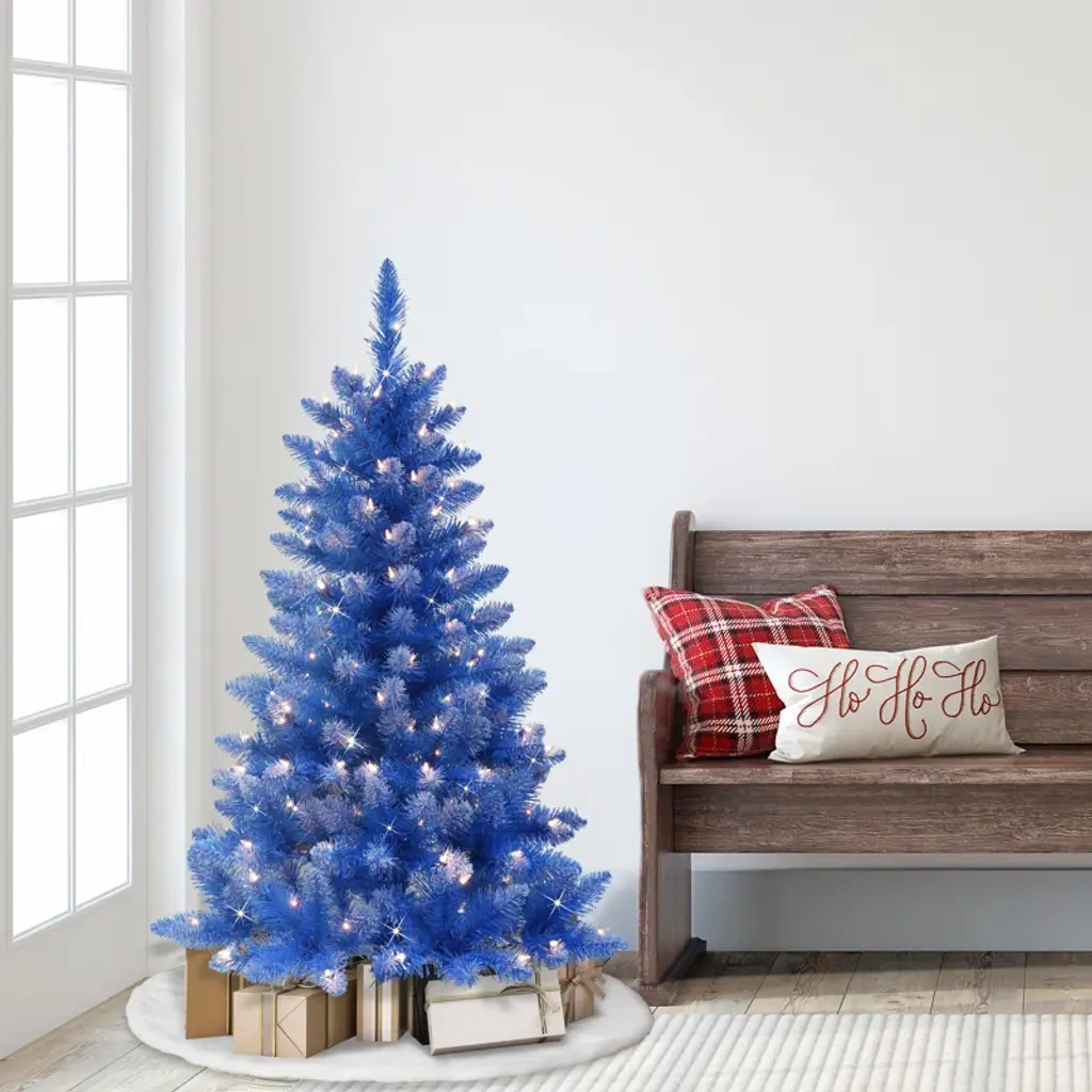 Deck the halls with The Holiday Aisle 4-foot Fashion Blue Pine Artificial Christmas Tree. Inspired by lush wintry forests, this artificial tree has 196 branch tips and 150 Incandescent Clear Lights. The incorporated lights mean no more climbing ladders to string lights, saving decorating time. When a single bulb burns out, the other lights on the strand will stay lit for your convenience. We recommend changing the burnt bulb to prevent future outages. Hypoallergenic and needle-shed resistant, the tree is a great alternative to a yearly real tree purchase. With easy-to-assemble pieces and an included base, your house will be ready for the holidays faster than you can say "Rockin' Around the Christmas Tree".
