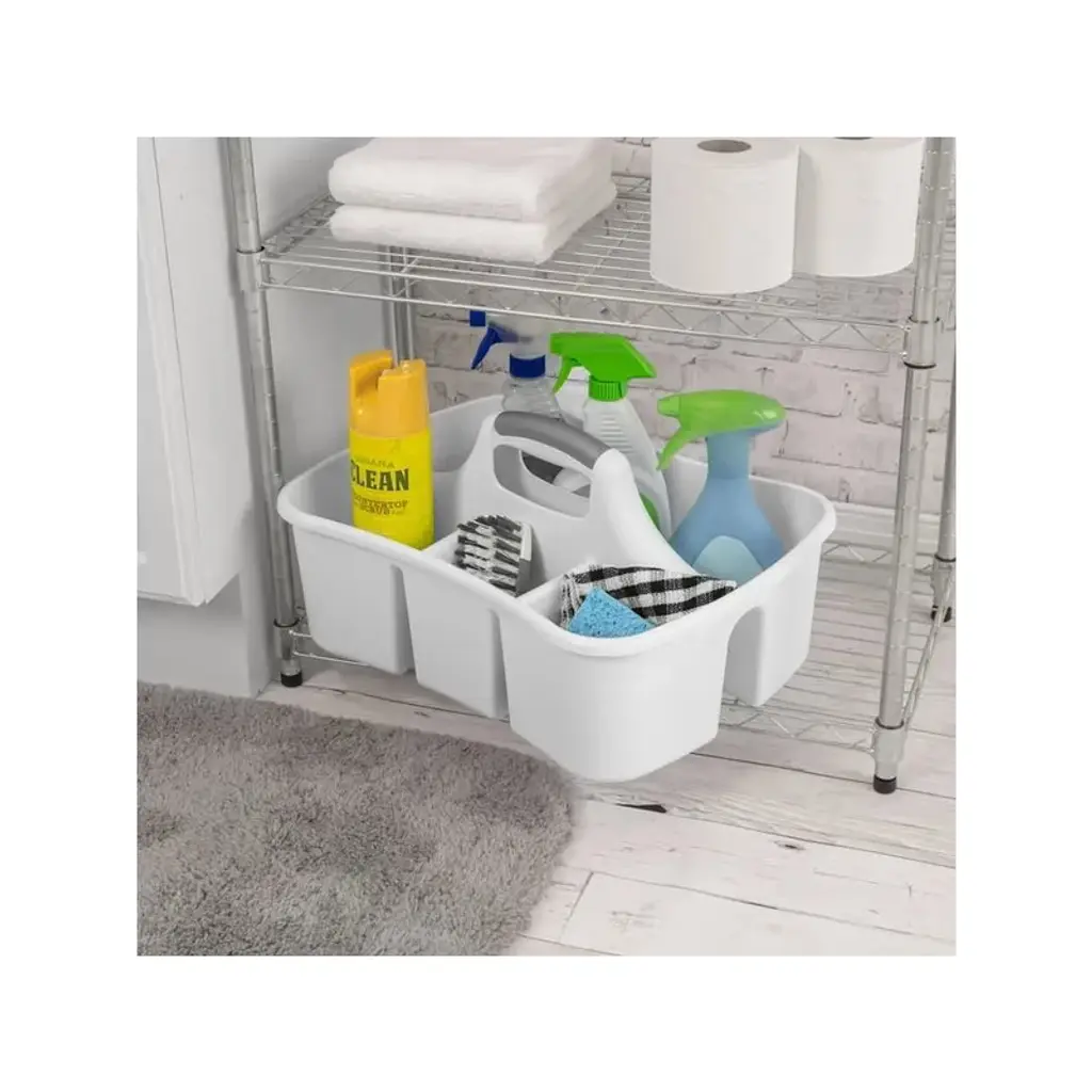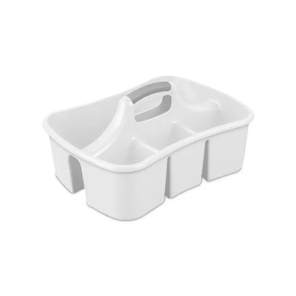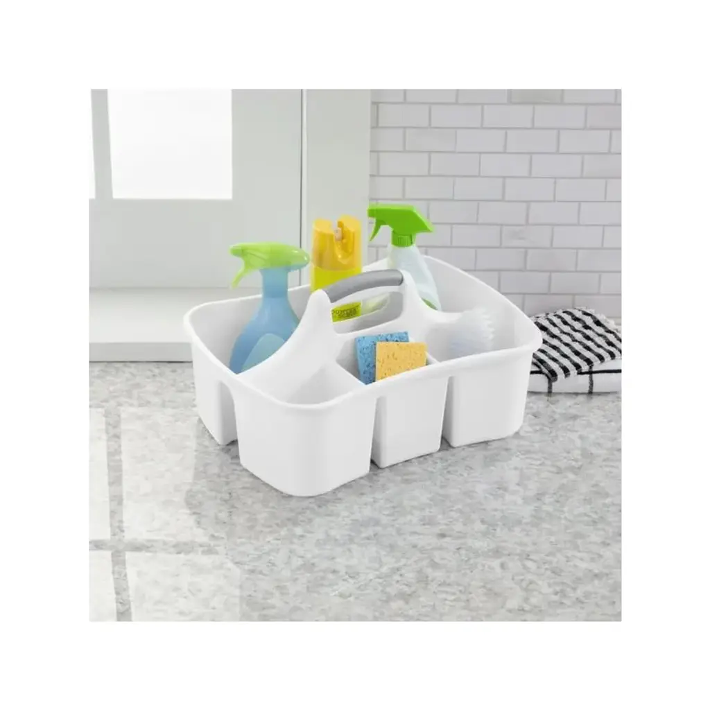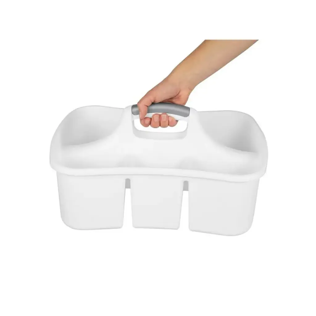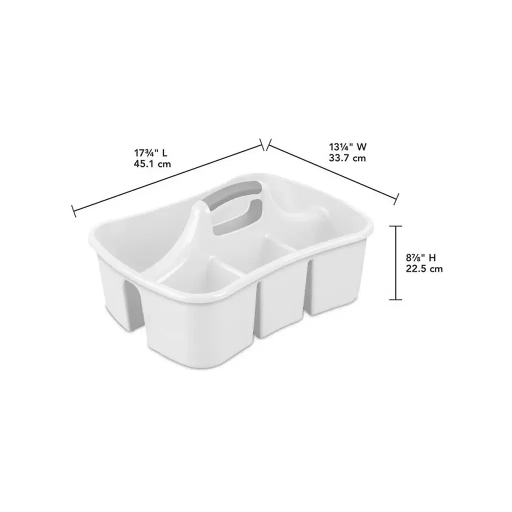 The Divided Ultra? Caddy is the ideal solution for all of your household chores. This large caddy is designed with four divided compartments and a large curved handle for a comfortable grip. High side walls keep cleaning supplies from tipping over when carried and it is carefully designed to fit underneath most standard sinks. Small compartments are ideal for sponges, rags and brushes while the large compartment is perfect for standard size spray bottles and paper towels. The overall assembled dimensions of this item are 17 3/4" L x 13 1/4" W x 8 7/8" H.