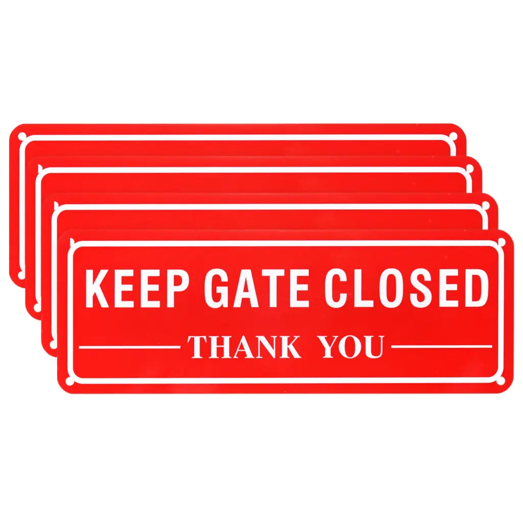 PRODUCT APPLICATIONSOur aluminum reflective signs are versatile. They can be placed in homes, offices, commercial buildings, and various places where they are needed. Its clear text can warn others easily.PRODUCT DETAILS & INCLUDE√ Material: Aluminum√ Color: White on Red√ Overall Size: 250mm x 90 mm / 10" x 3.5"(L x W)√ Package Includes: 4Pcs x Keep Gate Closed Thank you SignPRODUCT ADVANTAGES1. Our rust-free signs are made of high-strength rust-free aluminum with excellent durability, waterproof and anti-corrosion properties, not easy to bend and deform, and can be used indoors or outdoors for a long time without color fading or rusting.2. Our signboard is manufactured using a high-tech printing process with vibrant colors and eye-catching lettering, it is also reflective to remind others in the dark. It is a great choice for daily warning signsINSTALLATIONThis sign has pre-drilled holes so you can use zip ties, screws, double-sided tape, nuts, and bolts (installation accessories are not included), it can be mounted wherever you need it.