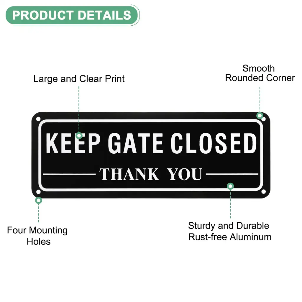 PRODUCT APPLICATIONSOur aluminum reflective signs are versatile. They can be placed in homes, offices, commercial buildings, and various places where they are needed. Its clear text can warn others easily.PRODUCT DETAILS & INCLUDE√ Material: Aluminum√ Color: White on Red√ Overall Size: 250mm x 90 mm / 10" x 3.5"(L x W)√ Package Includes: 4Pcs x Keep Gate Closed Thank you SignPRODUCT ADVANTAGES1. Our rust-free signs are made of high-strength rust-free aluminum with excellent durability, waterproof and anti-corrosion properties, not easy to bend and deform, and can be used indoors or outdoors for a long time without color fading or rusting.2. Our signboard is manufactured using a high-tech printing process with vibrant colors and eye-catching lettering, it is also reflective to remind others in the dark. It is a great choice for daily warning signsINSTALLATIONThis sign has pre-drilled holes so you can use zip ties, screws, double-sided tape, nuts, and bolts (installation accessories are not included), it can be mounted wherever you need it.