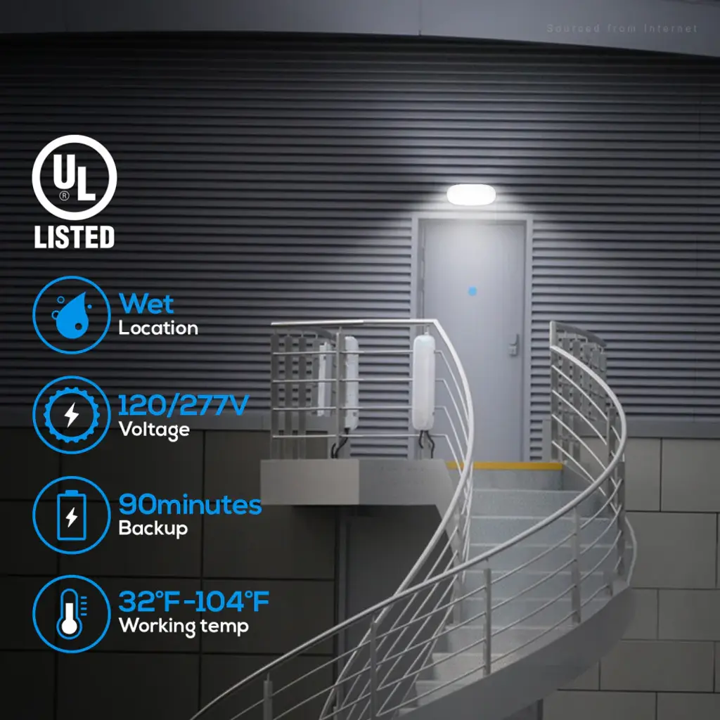 Safety AssuredThis emergency light, UL-listed for safe operation, meets United States fire inspection standards and International Fire Code regulations. Featuring a built-in 3.6V 2000mAh rechargeable battery, the light can provide over 90 minutes of continuous lighting following a power outage.Durability GuaranteedWith its removable protective shield and IP65 waterproof rating, this light is built to withstand dust, snow, water, and fire, protecting it from damage caused by foreign objects, snakes, mice, and ants. It is designed to thrive in harsh environments ranging from 32 to 104.Versatile UsageThe EVA foam on the back of the light serves to prevent water leakage and short circuits resulting from inadequate adhesion to uneven external walls, while also providing heat insulation. This enables the light to be utilized for a variety of indoor and outdoor applications, such as in traditional warehouses, parking lots, building perimeters, and corporate buildings.Superior Lighting PerformanceSetting itself apart from other emergency lights available, this light boasts a wider 120 degree beam angle and a powerful 400lm output that extends the lighting range to 20-70ft. Its adjustable light heads can pivot up to 300 degree, allowing for customizable angles to illuminate various areas.Effortless InstallationThis light is designed for easy and straightforward installation, making it a hassle-free process. In addition to functioning as a high-protection emergency light, it can also be utilized as a small tri-proof light. Furthermore, the inclusion of a 2-year warranty offers you added peace of mind and protection.