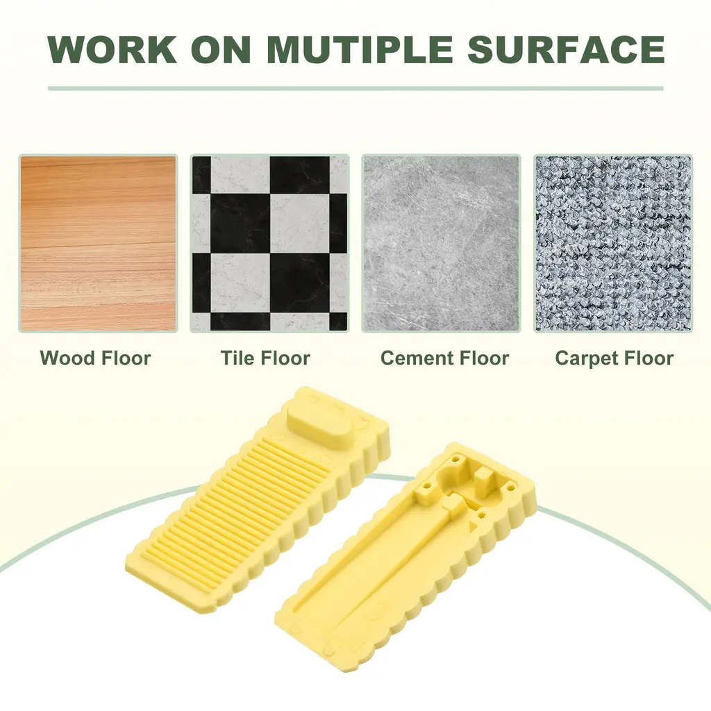 Description :Anti-Slip Overlay Design - The door stopper can be directly overlay to match larger gaps; and has a double-sided anti-slip function, with a horizontal stripe design on the surface, which increases the friction with the door and can easily fix the position of the door. The bottom hollowed-out anti-slip design keeps the door stable on the floor, with even force distribution during use, and is not easy to move.Material - The door stoppers for the bottom of the door are made of TPR, soft and non-slip, they will not scratch the surface of the floor or door; It has elasticity and can adapt to larger gaps, and can also be used on floors of various materials (wooden boards, ceramic tiles, and so on), and the trapezoidal design also provides cushioning force when closing the door.Easy Using - Place the door stopper on the floor at a suitable distance, which is easy to replace and does not affect cleaning. In addition to being used as a buffer and fixing when opening the door, it can also be used when closing the door to stop it from opening from the outside.Wide Applications - These door stops can be applied to various occasions, such as offices, homes, shops, hotels, etc; These door stops ensure that doors do not accidentally slip and close, so you don't have to worry about the door suddenly closing in winds, protecting the door and walls.Specifications:Material: TPRColor: YellowTotal Size: 98 mm x 40 mm x 14 mm / 3.86 Inch x 1.57 Inch x 0.55 Inch (L*W*H)Package Content:4 Pcs x Door Stoppers
