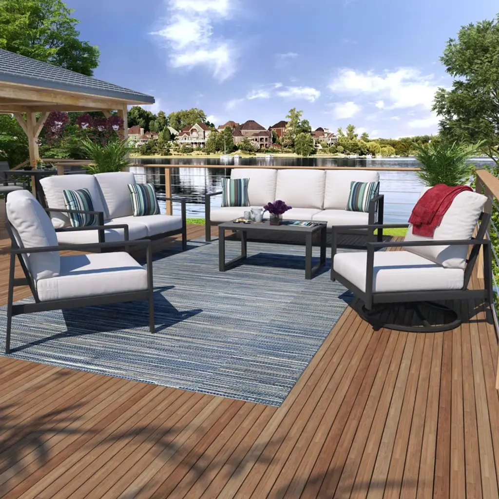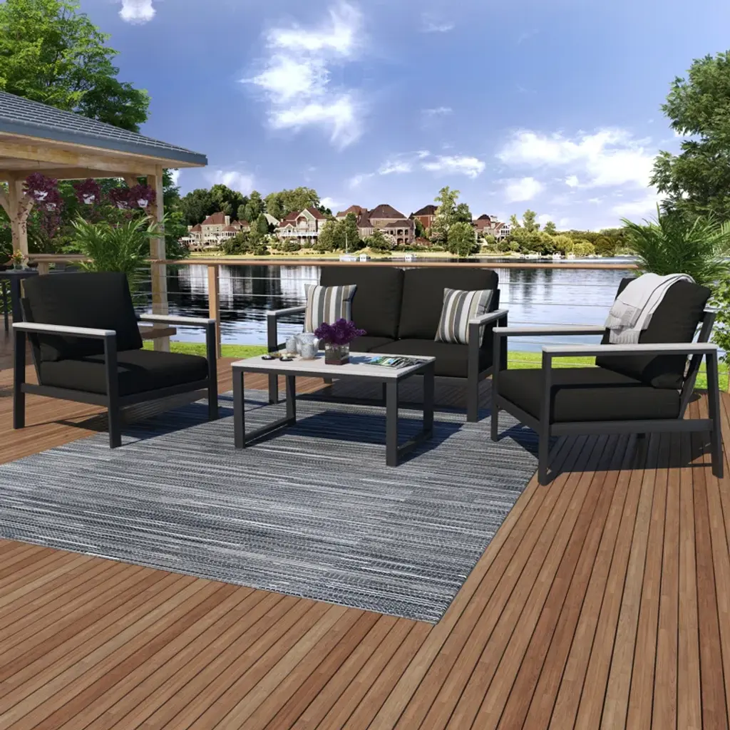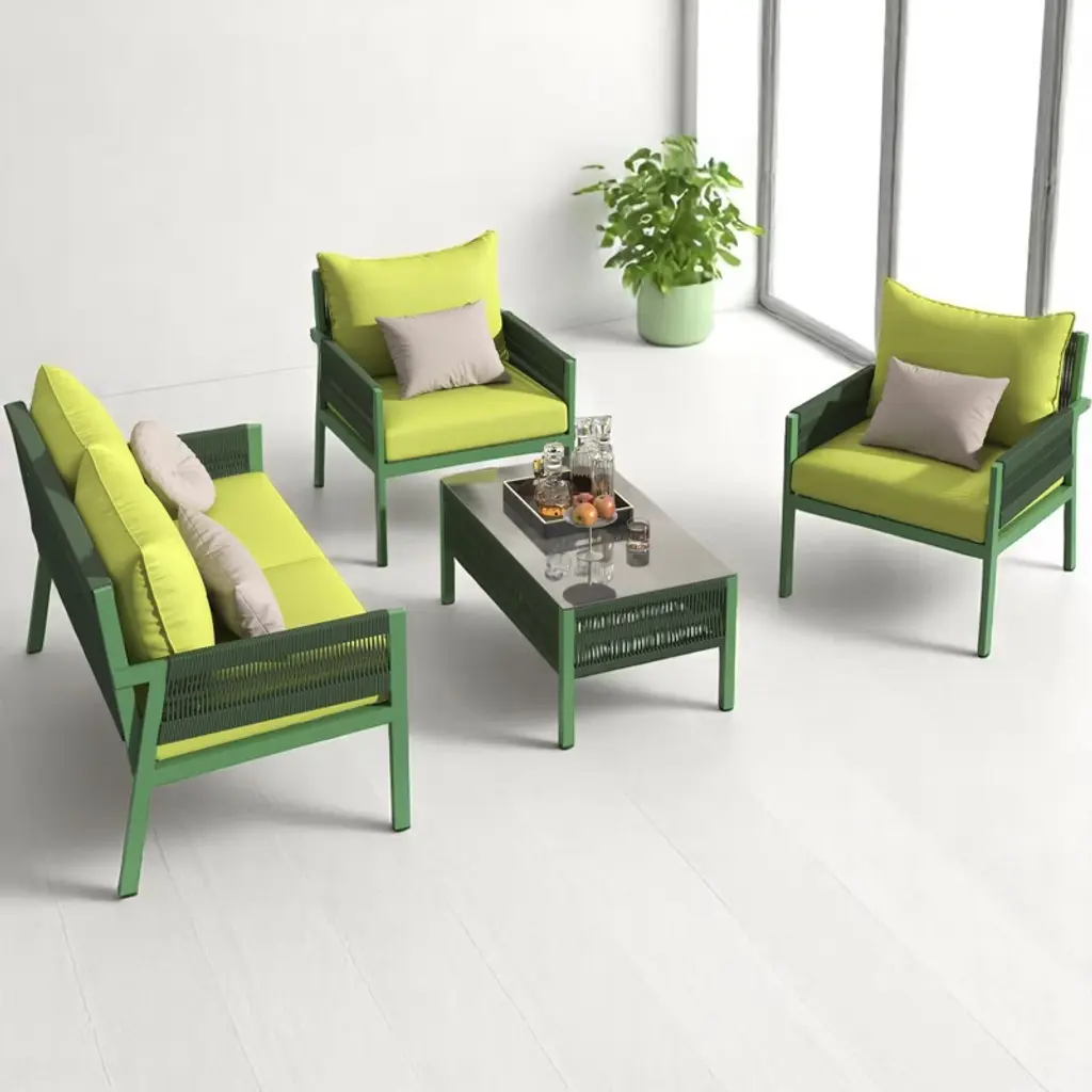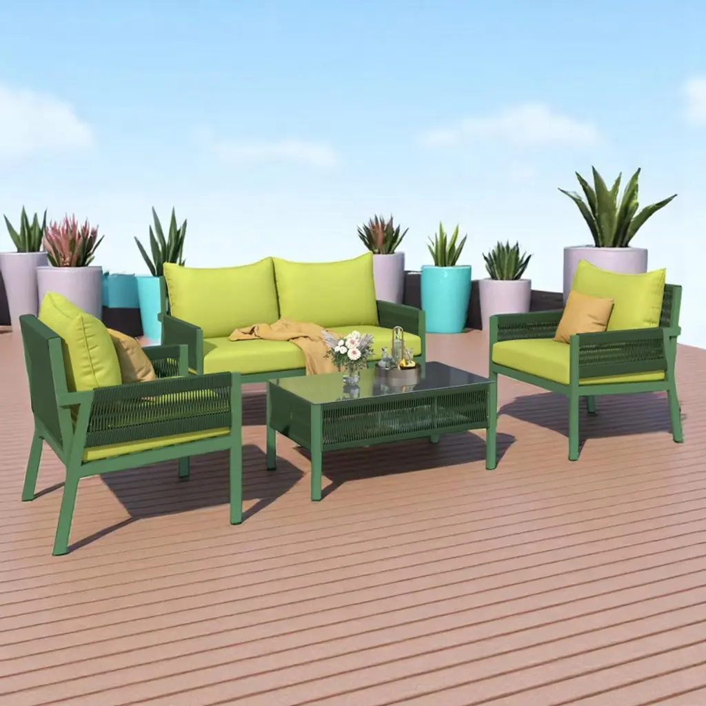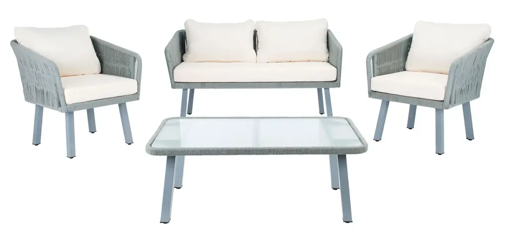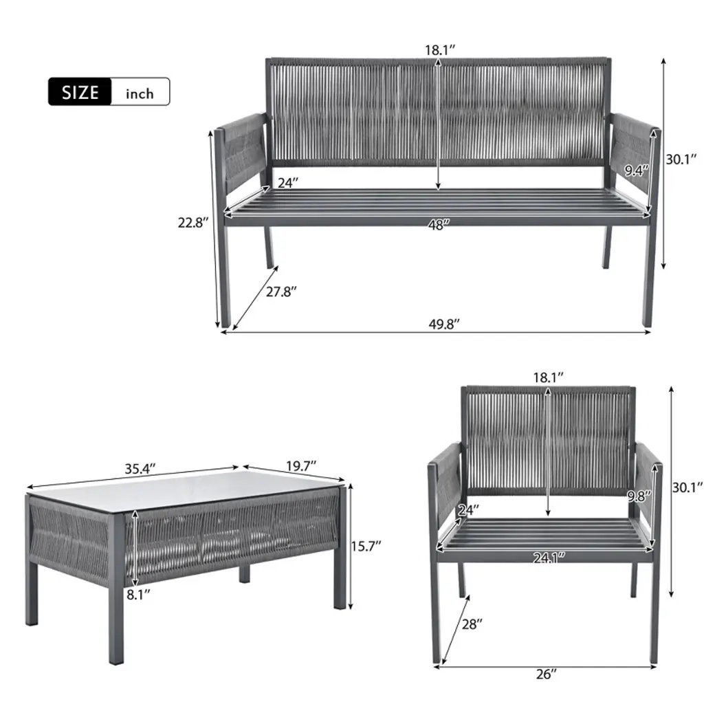 Product Overview Elevate your outdoor space with this 4-piece boho patio furniture set. Featuring handmade rope weave, a durable metal frame, and thick cushions, this set includes a loveseat, two single chairs, and a tempered glass coffee table. Water-resistant and UV-protected materials ensure lasting style and comfort, perfect for patios, gardens, balconies, or poolside areas. Product Features Handmade Rope Weave & Metal Frame: Crafted from 5mm PP rope and a sturdy frame, built to withstand outdoor conditions. Extra Thick Cushions: 3.9-inch thick cushions offer plush support and are water-resistant, UV-protected, and fade-resistant. Tempered Glass Coffee Table: Features an elegant glass top and rope accent design, ideal for serving or decor. High Weight Capacity: Loveseat supports up to 705 lbs; single chairs hold up to 350 lbs each for stable seating. Easy Maintenance: Removable, washable cushion covers and a wipe-clean frame and tabletop ensure hassle-free care. Specifications Dimensions: Chair: 25.98" L x 27.95" W x 30.55" H; Loveseat: 49.80" L x 27.75" W x 30.55" H; Table: 35.43" L x 19.68" W x 15.74" H Weight Capacity: Chair: 250 lbs; Loveseat: 705 lbs; Table: 125 lbs Material: PP Rope, Metal Frame, Tempered Glass, Polyester Cushions Assembly Required: Yes (30–40 minutes) Country of Origin: Vietnam Suitable Scenarios Perfect for patios, gardens, balconies, and poolside areas. Great for lounging, dining, or casual entertaining with a modern boho flair. Notes Cushion covers are removable and washable. Wipe frame and tabletop with a damp cloth. Actual colors may vary slightly due to lighting or screen differences. Dimensions may vary slightly due to manual measurement.