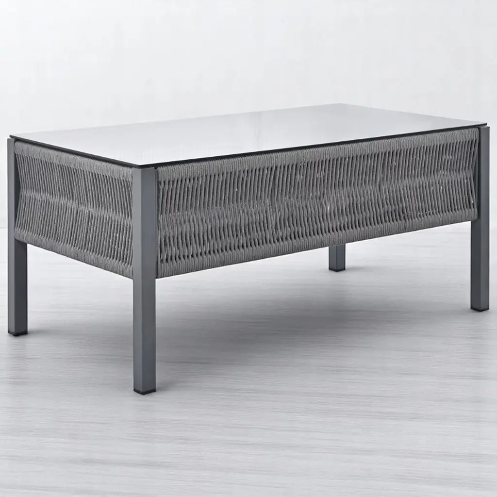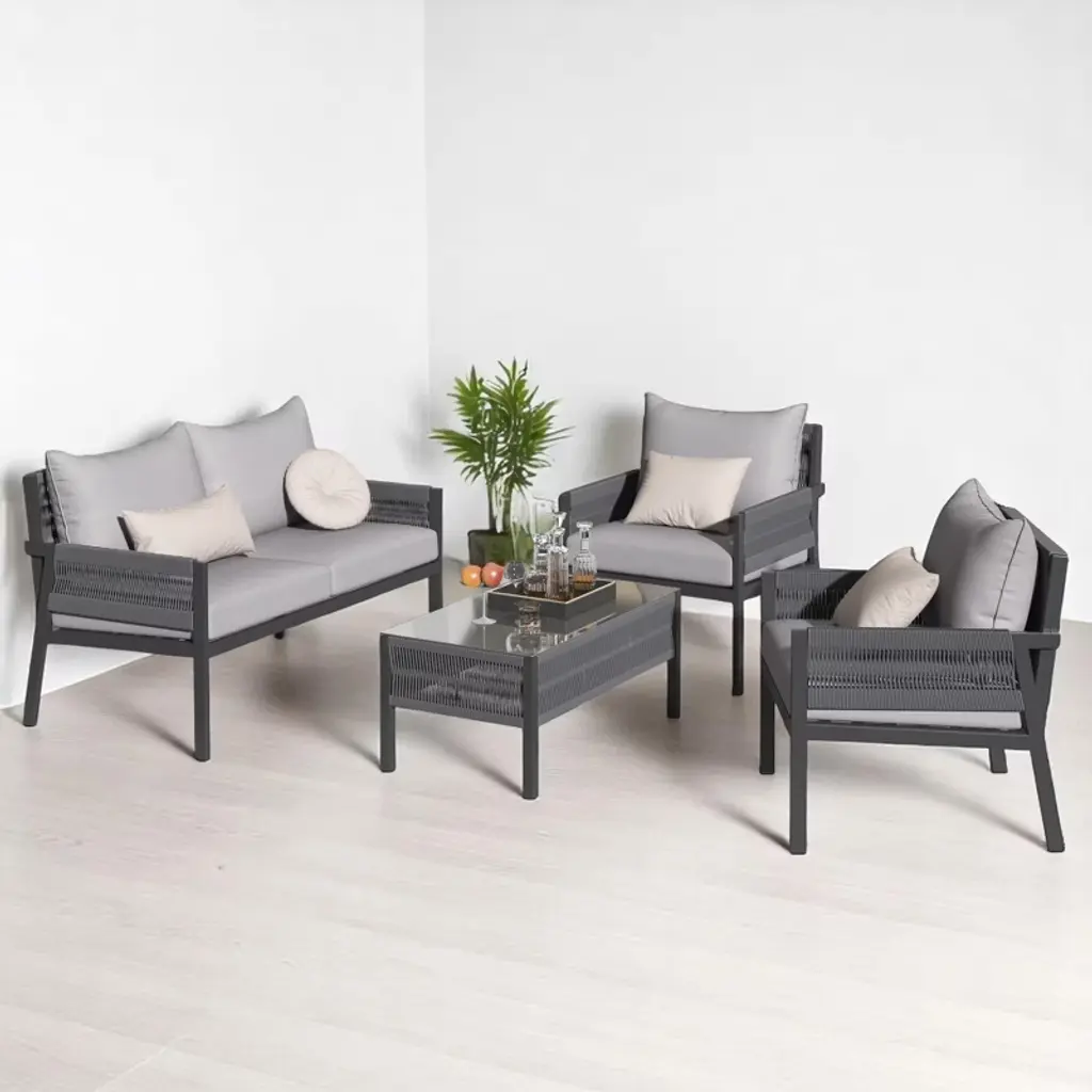 4-piece Boho Patio Furniture Set With Handmade Rope Weave, Metal Frame, Tempered Glass Table, And Thick Cushions-grey