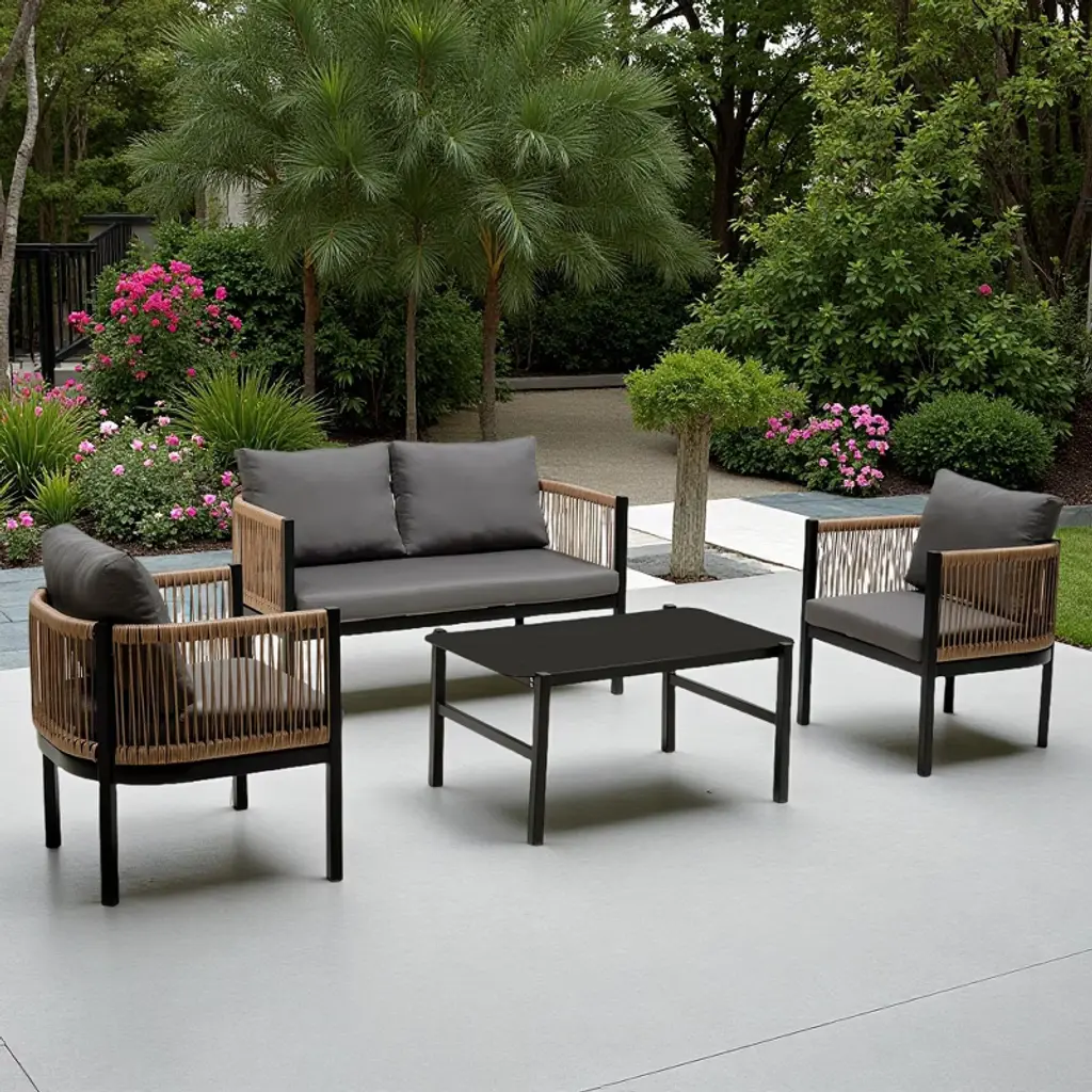 4-piece Outdoor Iron Cnversation Sofa Set With Coffee Table, Rattan Decoration