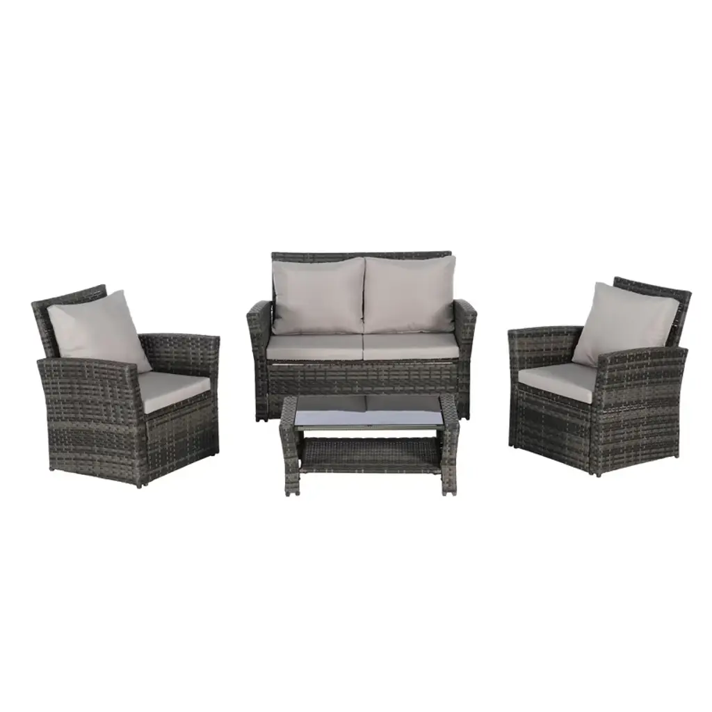 4 Pieces Outdoor Patio Furniture Set - Garden Rattan Chair Wicker Set This elegant 4-piece outdoor furniture set is crafted to bring both style and comfort to your patio, backyard, or garden. Designed with durability in mind, the set features a combination of high-quality PE rattan and a sturdy steel frame, ensuring it withstands the elements for years to come. Whether you're enjoying a quiet evening or hosting a gathering, this set is perfect for any outdoor setting. Product Features Strong Composite Weaving: Handwoven all-weather wicker material over fully-welded, powder-coated steel framing makes the furniture set very durable and sturdy, capable of enduring outdoor conditions.Large, Wide Seat Cushions: The oversized seat cushions are designed for comfort and come with smooth zippers, making them machine washable. Simply zip off the cushion covers for a quick wash, keeping your furniture looking brand new.Breathable Polyester Fabric: The cushion fabric is anti-UV, water-repellent, and breathable, offering long-lasting comfort, excellent color retention, and easy cleanability. It stands up to dust, rain, and sun, ensuring the set lasts for years.Customizable Configuration: This modular furniture set can be combined or separated in a variety of configurations to suit your gathering needs and outdoor space, whether it's your patio, backyard, balcony, or other outdoor settings. Product Description Coffee Table: Comes with a tempered glass top for an elegant look and easy maintenance.Two-Person Sofa: Measures 47.6 x 26.3 x 30.3 inches, offering ample space for two people to relax comfortably.Single-Person Sofa: Measures 26.3 x 26 x 13.8 inches, perfect for solo lounging or as an addition to your set.Coffee Table Dimensions: 34.3 x 19.7 x 13.8 inches, perfectly complementing the seating pieces.Materials: PE rattan and steel frame, ensuring long-term durability.Color: Rattan color is gray, and cushion color is red, adding a vibrant yet sophisticated touch to your outdoor d¨¦cor.Weight: Net weight is 83.6 lbs, gross weight is 88.22 lbs.Packaging: Packed in a box with dimensions of 46 x 24 x 16.8 inches for easy delivery. Important Notes: Screw Assembly: When assembling, don¡¯t tighten each screw initially. Leave them a little loose until all screws are in place, then tighten them all at once for best results.Manual Measurements: Please note that manual measurements have been used, and slight variations may occur.Color Discrepancy: Due to lighting conditions, actual product colors may slightly differ from the photos shown.Weather Precaution: We recommend taking precautions during inclement weather conditions to protect the furniture. Modular Wicker Sectional Flexible Configuration: This sectional set fits a variety of living space styles and can be arranged in many configurations, making it adaptable to your outdoor space, whether on the patio, porch, backyard, balcony, poolside, or garden.All-Weather Wicker: The set is crafted from tough, durable, and comfortable all-weather wicker, designed to withstand the elements.Easy Maintenance: The set is easy to manage, clean, and maneuver, providing both convenience and style for your outdoor environment.