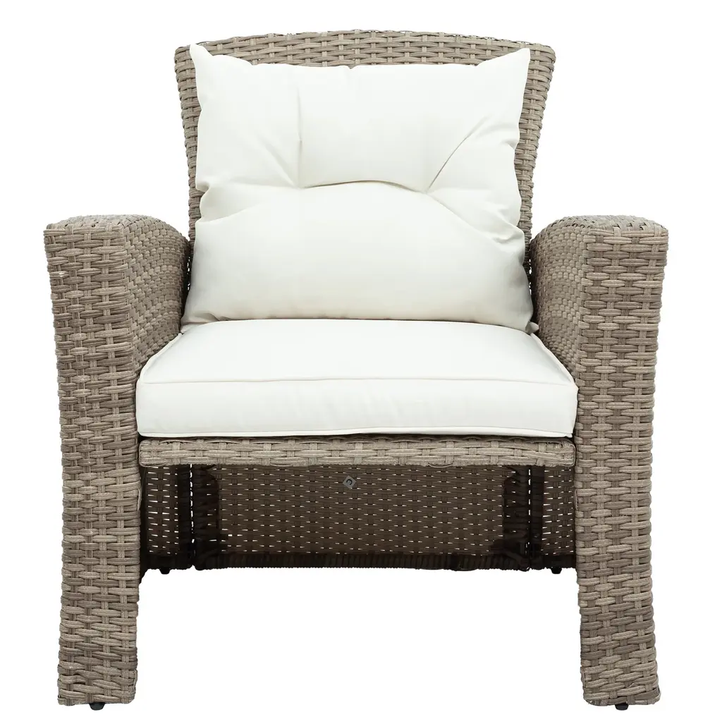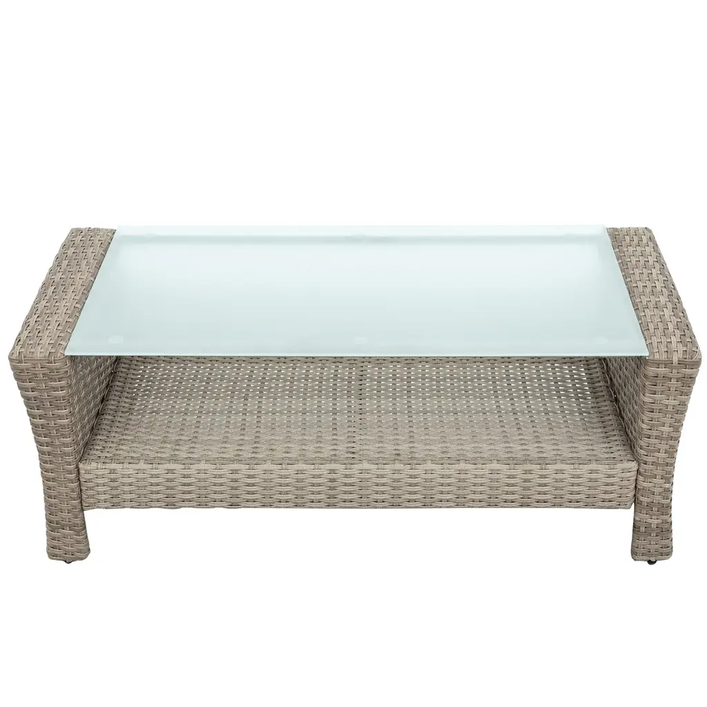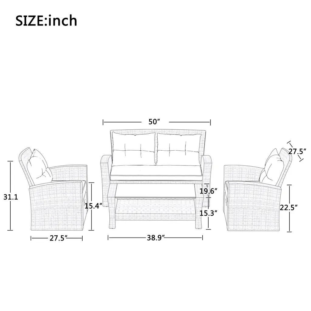 Weights & Dimensions Twin Seat Size 50''x27.5''x31.1'' Single Seat Size 27.5''x27.5''x31.1'' Coffee Table Size 38.9''x19.6''x15.3'' Specifications Items Included 1 Love Sofa+2 Single Sofa+1 Coffee Table Table Top Material Glass Frame Material PE Rattan Seating Capacity 4 Single Sofa Weight Capacity 220 lbs Love Sofa Weight Capacity 440 lbs Supplier Intended and Approved Use Residential Use Country of Origin Vietnam Notice About Color Due to screen display or light problems, the color of the products received may be slightly different from the pictures, Please refer to the actual product for the actual color. About Size Sizes are measured manually, there will be some slight differences.
