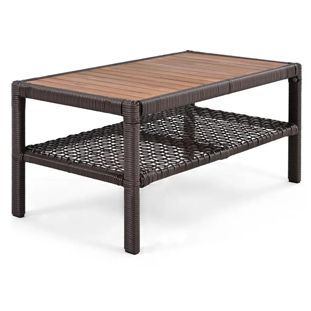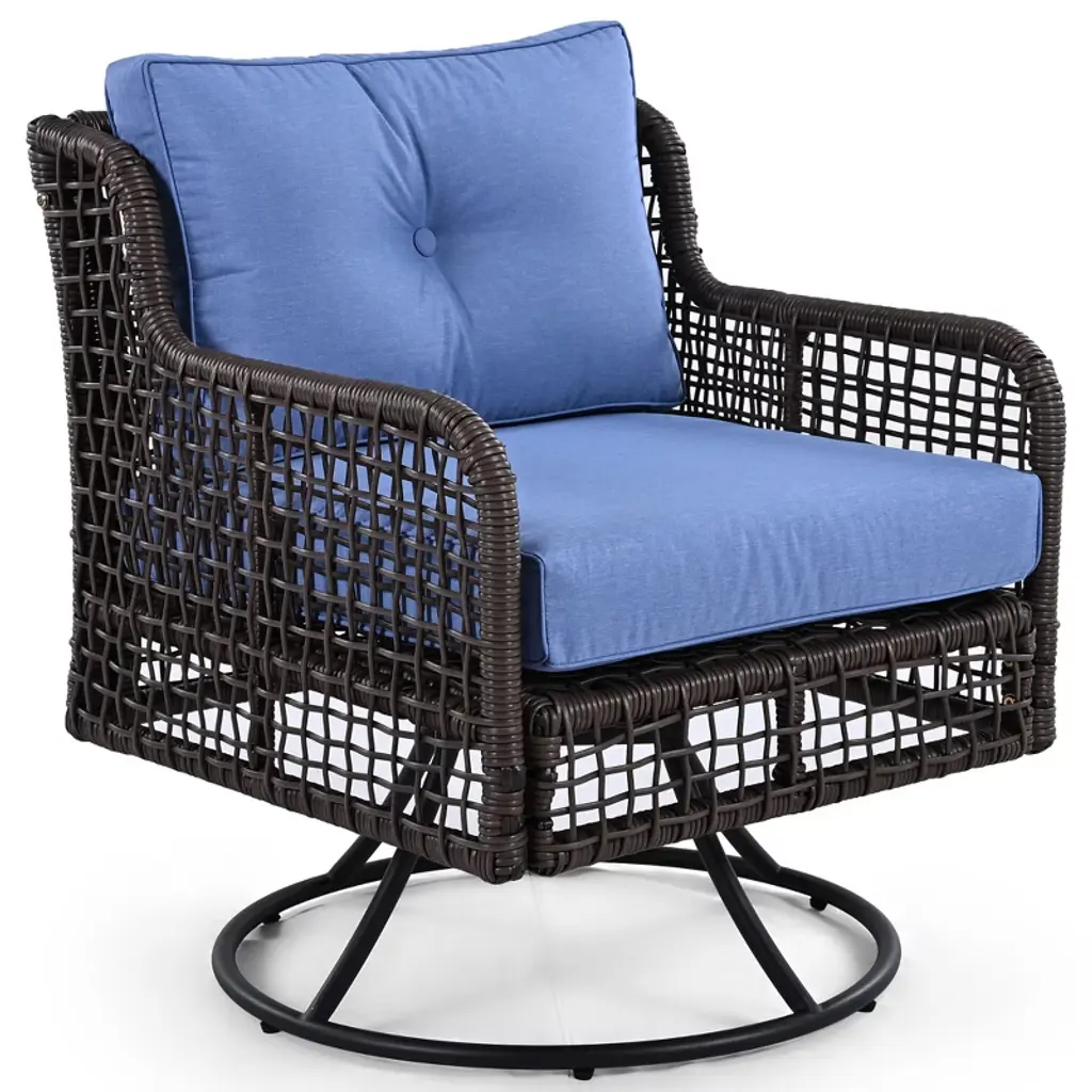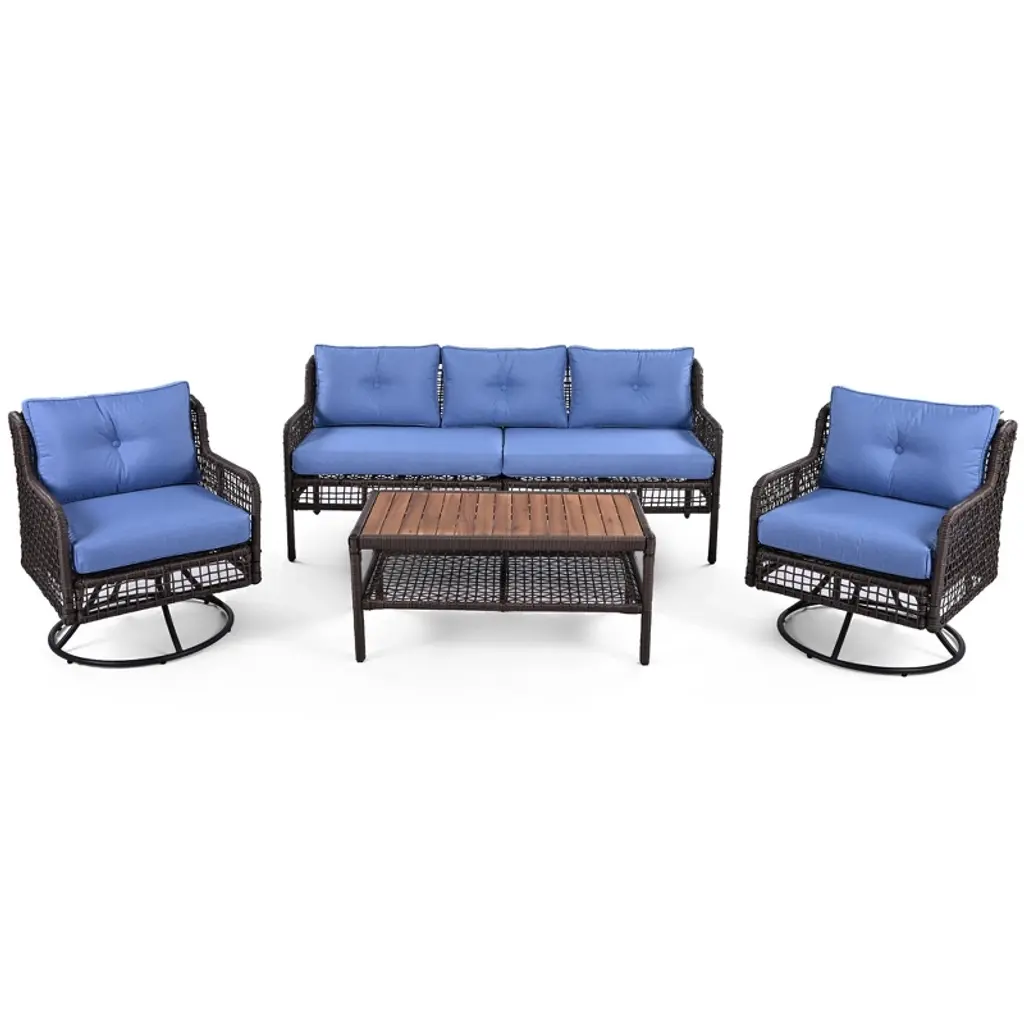 Elegant Rattan Patio Furniture Set This stylish and functional 5-piece patio furniture set combines elegance with comfort, perfect for transforming your outdoor space. Featuring an exquisite rattan hollow weave design and high-quality materials, this set brings a sophisticated touch to your garden, lawn, backyard, or poolside area. Whether you're hosting friends or enjoying a peaceful moment outdoors, this set offers the ultimate relaxation experience with its ergonomic design and versatile features. Product Features Elegant Rattan Appearance: This set showcases a beautiful rattan hollow weave design, giving it a chic, modern look. Made with high-quality PE rattan and a rust-proof iron frame, it¡¯s durable and built to withstand harsh weather conditions.Ultimate Ergonomic Comfort: The set includes thickened seat and back cushions filled with high-density sponge for optimal support and comfort. The ergonomically designed armrests and backrest enhance relaxation for a more enjoyable seating experience.Wood Tabletop: The solid wood coffee table features an elegant natural grain finish and convenient storage compartments. Durable and weather-resistant, it¡¯s perfect for both indoor and outdoor use.360¡ã Swivel Rocking Chair: This set includes an upgraded modern swivel chair that can rotate 360 degrees, allowing for full movement without leaving your seat. With armrests and smooth rocking motion, it adds a new level of comfort and relaxation to your outdoor space.Versatile Patio Furniture Set: The set includes one 3-seater sofa, two swivel chairs, and one solid wood coffee table, offering 5 comfortable seating spaces. You can rearrange the pieces to fit your patio, deck, garden, balcony, poolside, or porch.About Installation: The set is easy to assemble with clear instructions and all necessary tools included. Two people can complete the assembly in about 1 hour. The waterproof cushion covers feature zippers for easy removal and cleaning. Product Description Net Weight: 3-seat Sofa: 55.07 lbsSwivel Chair: 34.14 lbsCoffee Table: 22.03 lbs Weight Capacity: Sofa: 400 lbs per seatTable: 220 lbs Material: The furniture is made from polyester and sponge cushions, high-quality PE rattan, and a rust-proof iron frame, ensuring durability and comfort.Assembly Time: Approximately 1 hour for two people to assemble the entire set. Notice: Color Disclaimer: Actual product colors may vary slightly due to lighting conditions or monitor settings.Maintenance: To maintain the beauty of your furniture, wipe down the PE rattan and tabletop regularly and remove and clean the cushion covers as needed.Weather Protection: To extend the life of your furniture, cover or store it during extreme weather conditions such as heavy rain or snow.