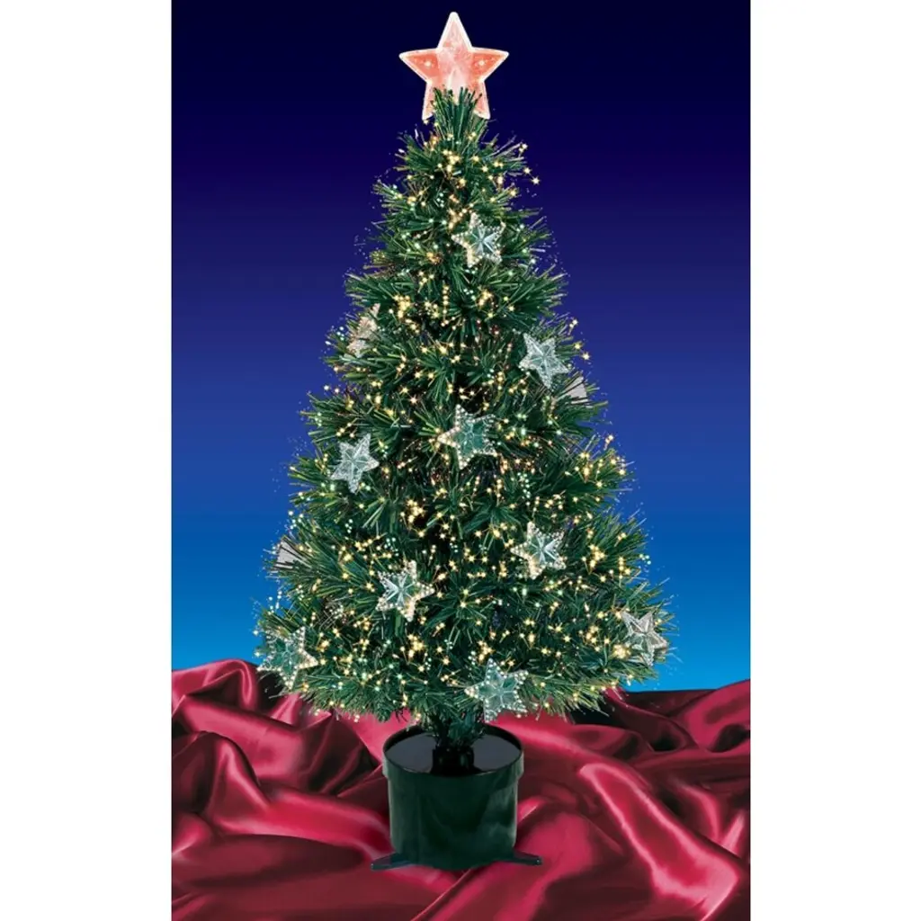 Spread the festive ambiance to your space with this pre-lit artificial Christmas tree. This tree with star embellishments is sure to make your home more welcoming and attractive for a holiday gathering. Your guests will love to capture some of their beautiful pictures in front of this lovely tree. Product Features: 160 branch tips Pre-lit fiber optic tree has a multi-color wheel at base Fiber optic colors includes red, green, amber, purple, blue and white Comes with a black plastic pot Medium profile tree 2-piece easy assembly (including pot) UL certified and approved for indoor use only 72" black lead cord with adapter Input: 120 volts, 60 hertz, 27.6 watts, .23 amps Dimensions: 4' high (from the base of the pot to the top of the tree) 25" base diameter (at the widest point) Pot dimensions: 6" high x 7.5" wide Material(s): fiber optics/plastic/PVC/wire