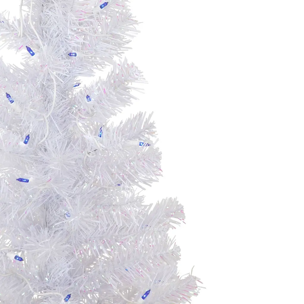 With its immaculate color and generous profile the Rockport White Pine Christmas tree glistens with wintry beauty. It is a designer-inspired alternative to a traditional green tree with its dazzling white pine needles. The branches contain a mix of matte white and clear iridescent needles that create texture and add depth to the tree. The iridescent needles beautifully reflect the soft glow from the blue incandescent mini lights. This tree is perfect for a quick and easy setup and ideal for corners or tabletops. Product Features: Pre-lit with 70 lights Bulb size: mini Bulb type: incandescent 110 tips Slim profile tree Additional Product Features: If one bulb burns out the rest will stay lit Light sets on tree are UL listed for indoor or outdoor use however the tree itself is recommended for indoor use only Lights are equipped with Lamp Lock feature which makes them replaceable interchangeable and keep them from falling out Contains 1 plug with end connector Connector allows to stack multiple lighted items together (not to exceed 210 watts) 3-piece easy assembly (including stand) Includes a white plastic tree stand Wire gauge: 22 120 volts 60 hertz .24amps 28.8 watts Dimensions: 4' high (from the base of the stand to the top of the tree) 24" base diameter (at the widest point) Material(s): PVC/plastic/glass bulbs/wire Note: Branches are compressed for shipment and need to be fluffed out upon arrival to look like the photo.
