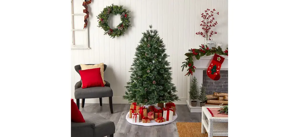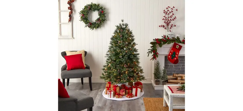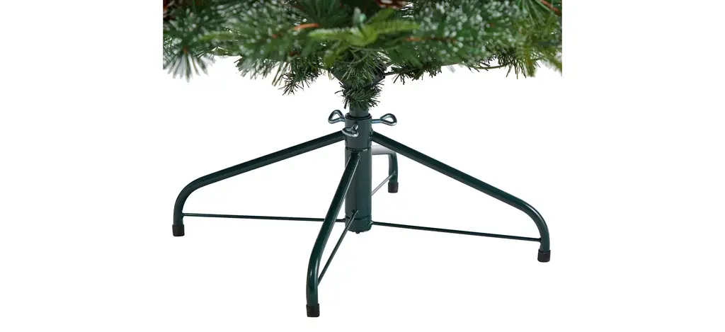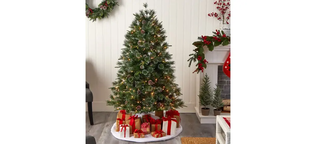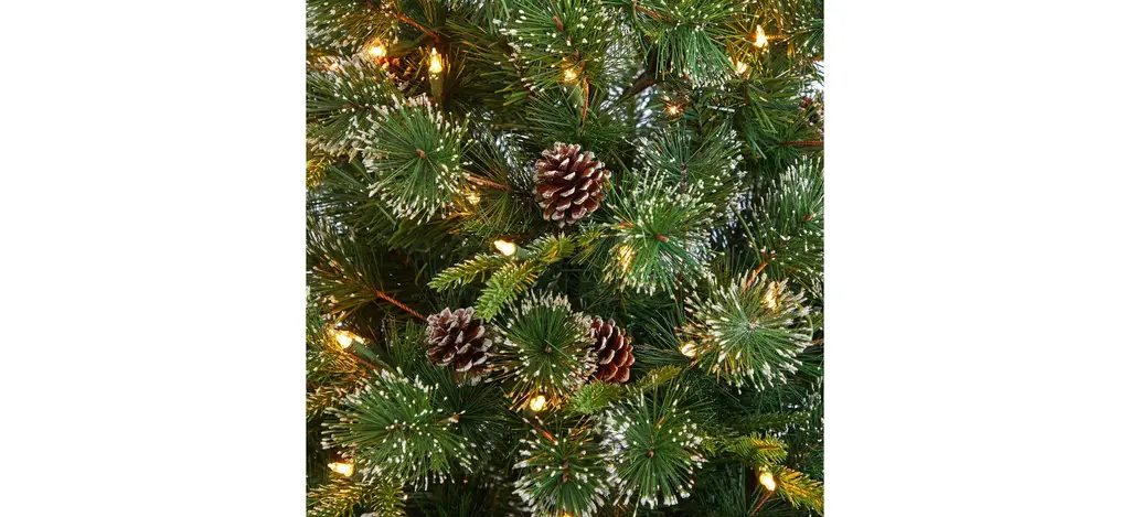 Recreate a snowy Christmas with the Snowed Tipped Clermont Mixed Pine Artificial Tree . Arriving pre-strung with 200 clear lights and accented with pinecones throughout for a natural, rustic look, house this faux Christmas tree in any narrow area.