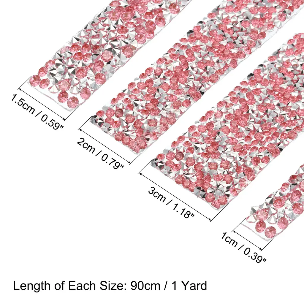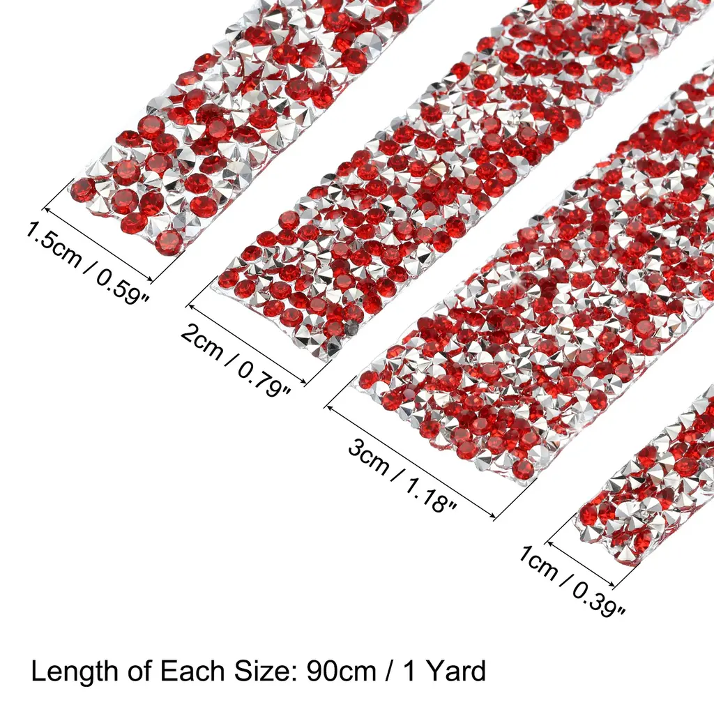 What is this?Crystal belts can mainly be used to decorate different occasions and items in your life. You can use it for decoration of furniture, cakes or handicrafts, and you can also use it for decoration on different parties, such as weddings, birthday parties, and other holidays, etc.What will I get?Color: Silver Base Red;Material: Resin;Each Size(L*W):90cm x 1cm/1 Yards x 0.39 inches;90cm x 1.5cm/1 Yards x 0.59 inches;90cm x 2cm/1 Yards x 0.79 inches;90cm x 3cm/1 Yards x 1.18 inches;In the package of: 4 Roll x Diamond RibbonAre there any advantages of the product?1. This crystal ribbon is made of resin, using good craftsmanship to make all the surfaces shine, smooth and flat, and they are bling no matter under natural light or light.2. The resin diamond ribbon has a double-sided tape, you can cut the size you want according to your needs, directly tear off the tape on the back during use, and stick it directly on the surface of the item.3. The decoration sticker are not easy to fall off, and the adhesive performance is stable. You can use it to easily stick to the surface of the itemsHow to use it?You just need to cut the diamond gems sticker to the length you need and use it to diy your items. Wipe the surface of the item before use, then tear off the adhesive sticker and stick it onWhat should I notice?Within 48 hours of use, do not let the craft come into contact with liquids