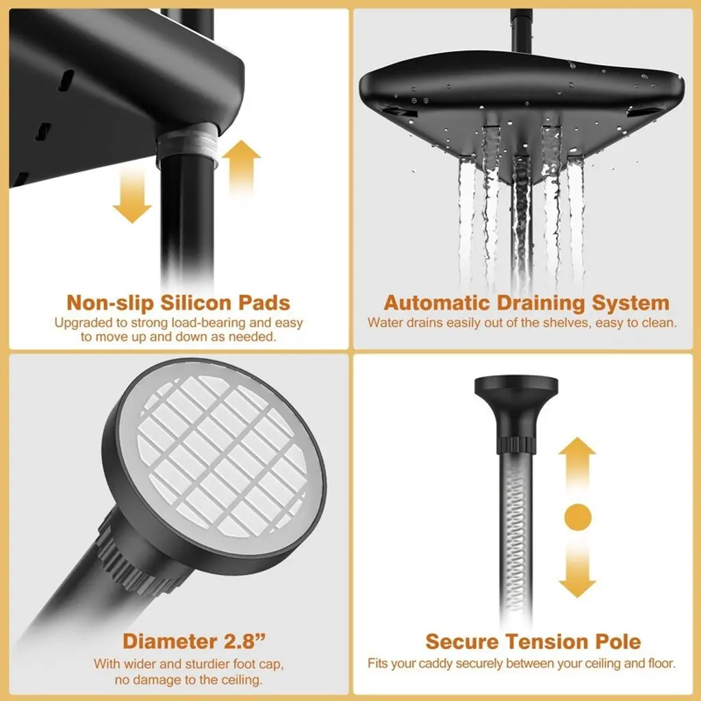 4-Tier Adjustable Corner Shower Caddy With Tension Pole, 56-115 Inch, Rust-Resistant - Black