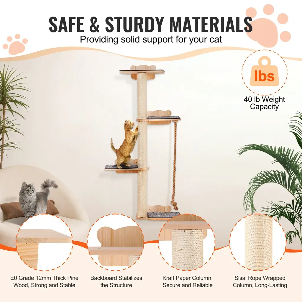 Fun Playground for Cats: For 23.7*10.6*49.8inch, this cat wall shelf includes 4 jumping boards, 3 cat posts, and 1 cat rope, catering to your cat's needs for climbing, playing, resting, and scratching.For 6.7*6.7*73inch, this cat wall shelf includes 4 jumping boards, 4 cat posts, and 3 toy balls, catering to your cat's needs for climbing, playing, resting, and scratching It creates a rich environment for your feline to enjoy hours of fun and relaxation. Comfortable and Durable Material: Made from E0-grade pine wood, this wall mounted cat shelf is sturdy and durable, capable of supporting up to 40 lbs (18.14 kg). The natural pine wood is non-toxic and odorless, allowing cats to climb and play safely. The platform surface is covered with a plush pad for slip-resistance and softness, protecting your cat's paws. Easy Installation: The package includes all necessary accessories and an installation guide. Simply follow the steps, insert the expansion tubes into the wall, and secure the boards using screws. The installation process is straightforward, allowing one person to easily set it up in no time. Comprehensive Accessories: The cat wall furniture set comes with metal screws, expansion tubes, butterfly anchors, a screwdriver, T-shaped hex screwdriver, and an installation diagram for hassle-free mounting on various wall types. Versatile Use: Our cat wall furniture set can be freely arranged to suit different spaces and preferences. With its minimalist and cute design, the wall-mounted setup saves floor space and blends perfectly with your home decor, whether installed in the living room, bedroom, or patio wall. Package Content 1 x Cat Wall Shelf Set