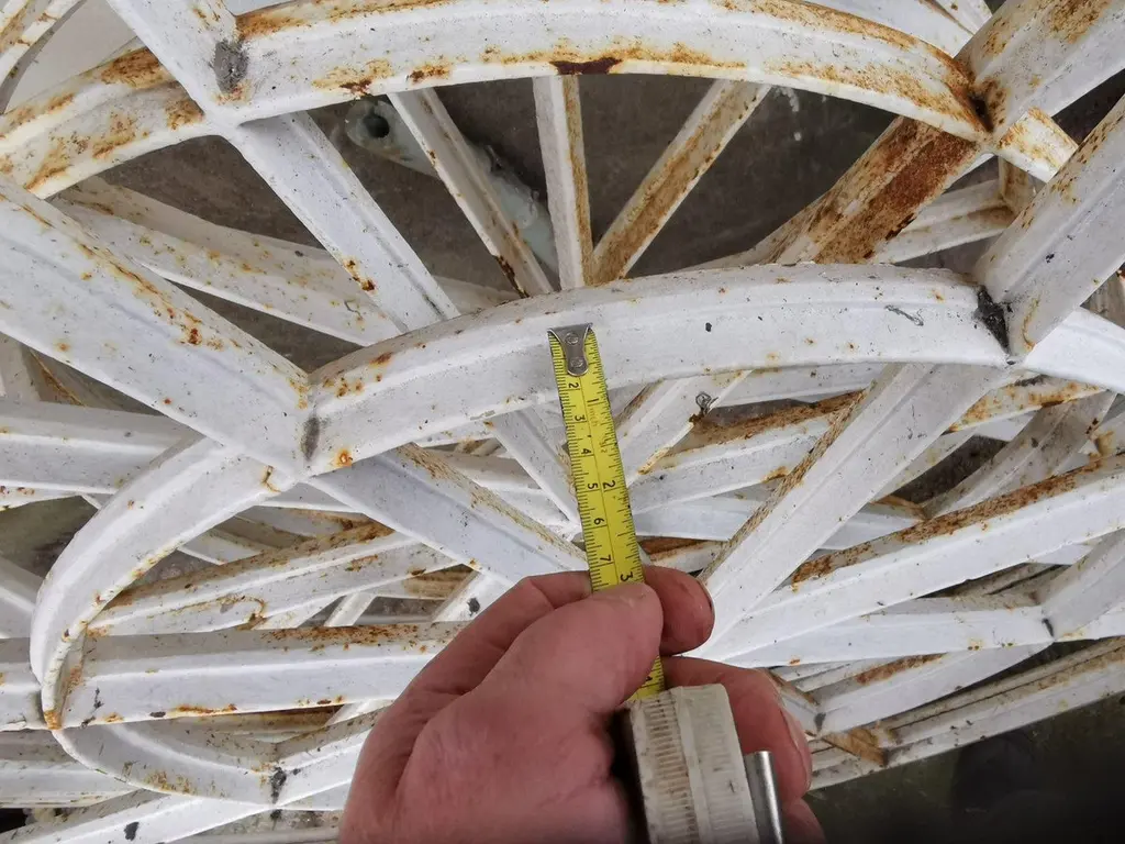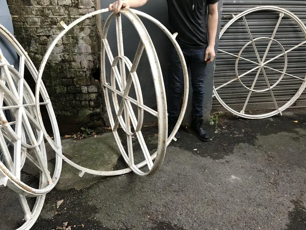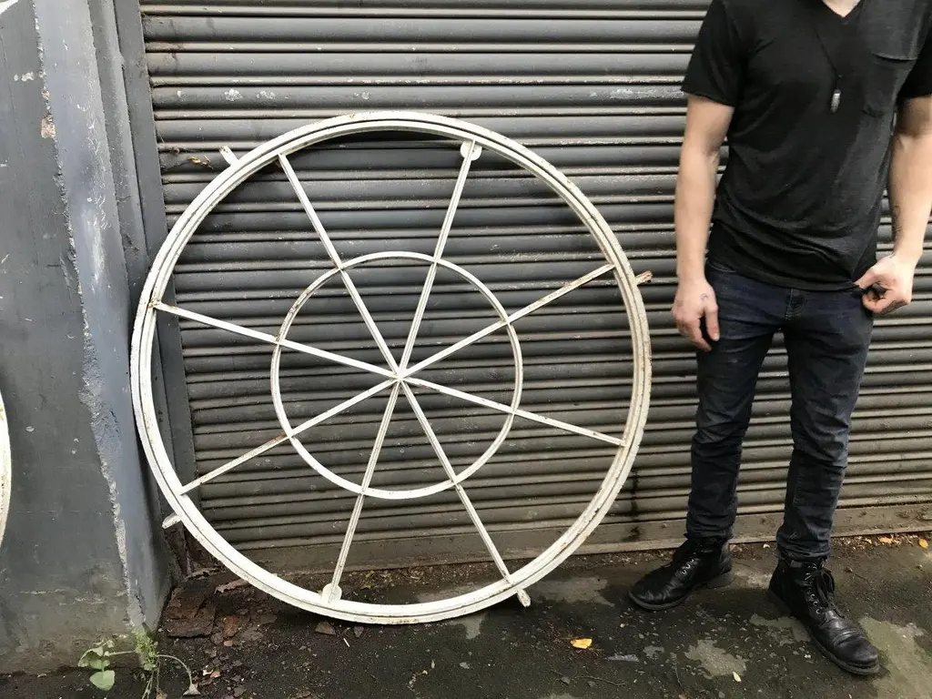 Four very good quality Victorian cast iron circular swivel windows with a segmented triangular design. The windows open perfectly with no wear to the pins or frames and the rebated section fits snugly into place when closed. They all open a little past center then stop on a stop, which you can see in images ten and eleven, at the bottom where it's pinned. They have catches to secure them when closed, and eye hooks to open them with a pole, those may need a little refurbishment.They are ready to build into something with the external securing extending arms still intact 1.75 inches, and 17mm glazing bars for the glass or double glazing.