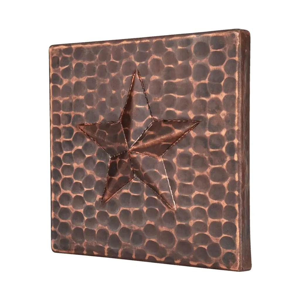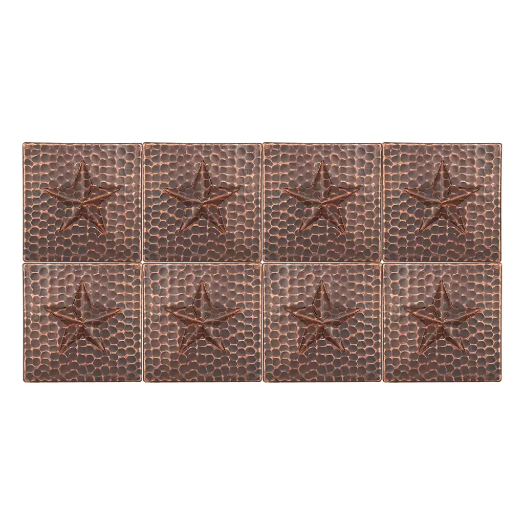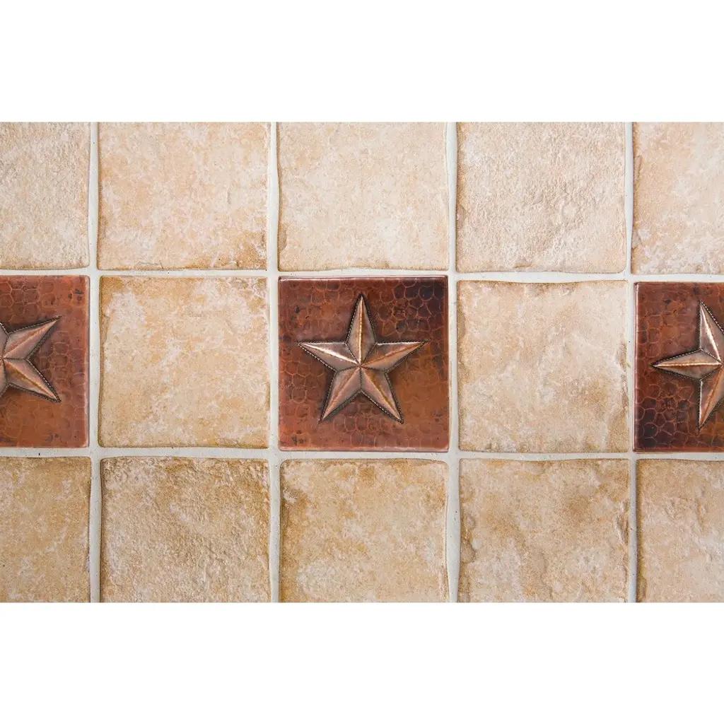 Copper Tiles are the ideal option to accentuate your home. You can create a focal point with an assortment of designs to choose from. Mix and match with our other sized tiles to create an eye-catching design.4" x 4" Hammered Copper Star Tile Package of 8 Features:IMPORTANT NOTE: DUE TO THE HANDCRAFTED NATURE OF THIS PRODUCT SMALL VARIANCES IN SIZE AND COLOR MAY OCCUR.Tile Packages Suggested Accessories: