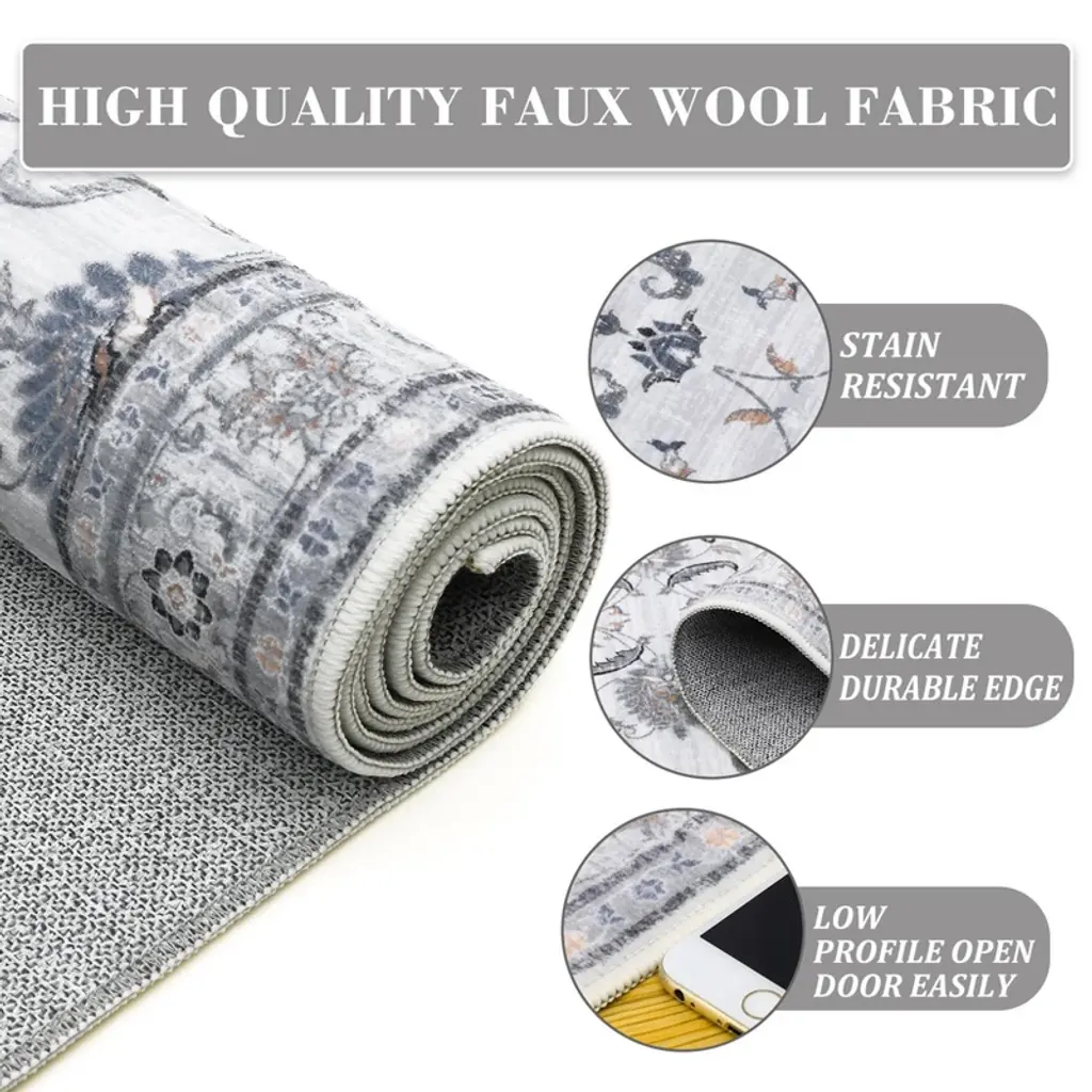 Durable Edges: This rug with durable edges can prolong its service time and be kept simply.Not Hide Dirt: The rug with low pair height provides a clean and safe environment, the hidden dirt in this rug can be found and cleaned simply.Kids Pets Friendly: Features low pile height, this rug makes hairs and pet dander easy to spot and clean, prevents children and pets from accidental ingestion, children and pets can play freely on it.Ultra Soft Surface: This rug crafted from imitation , it offers relaxation whether working, reading or resting, maintains a soft and comfortable feel underfoot.Non-slip Backing: Features a non-slip backing for secure placement and high durability for high traffic areas.
