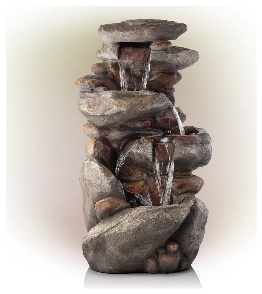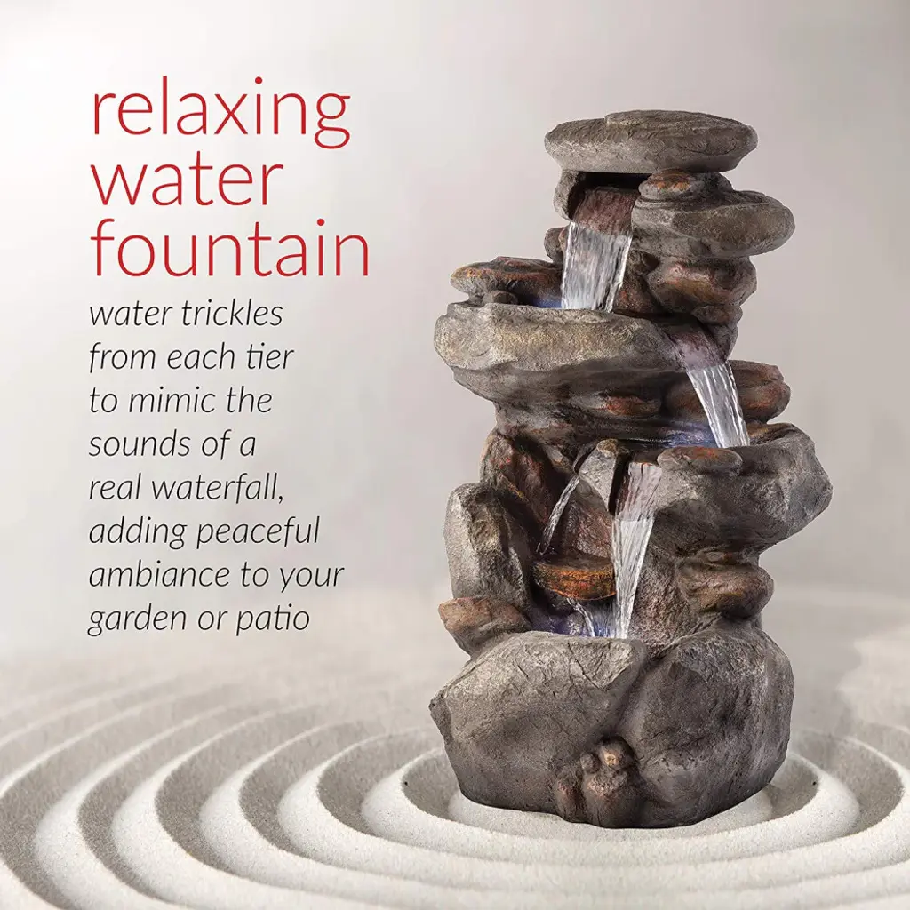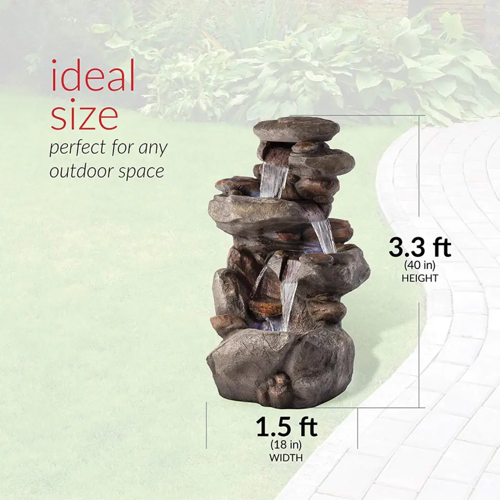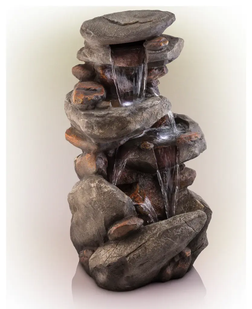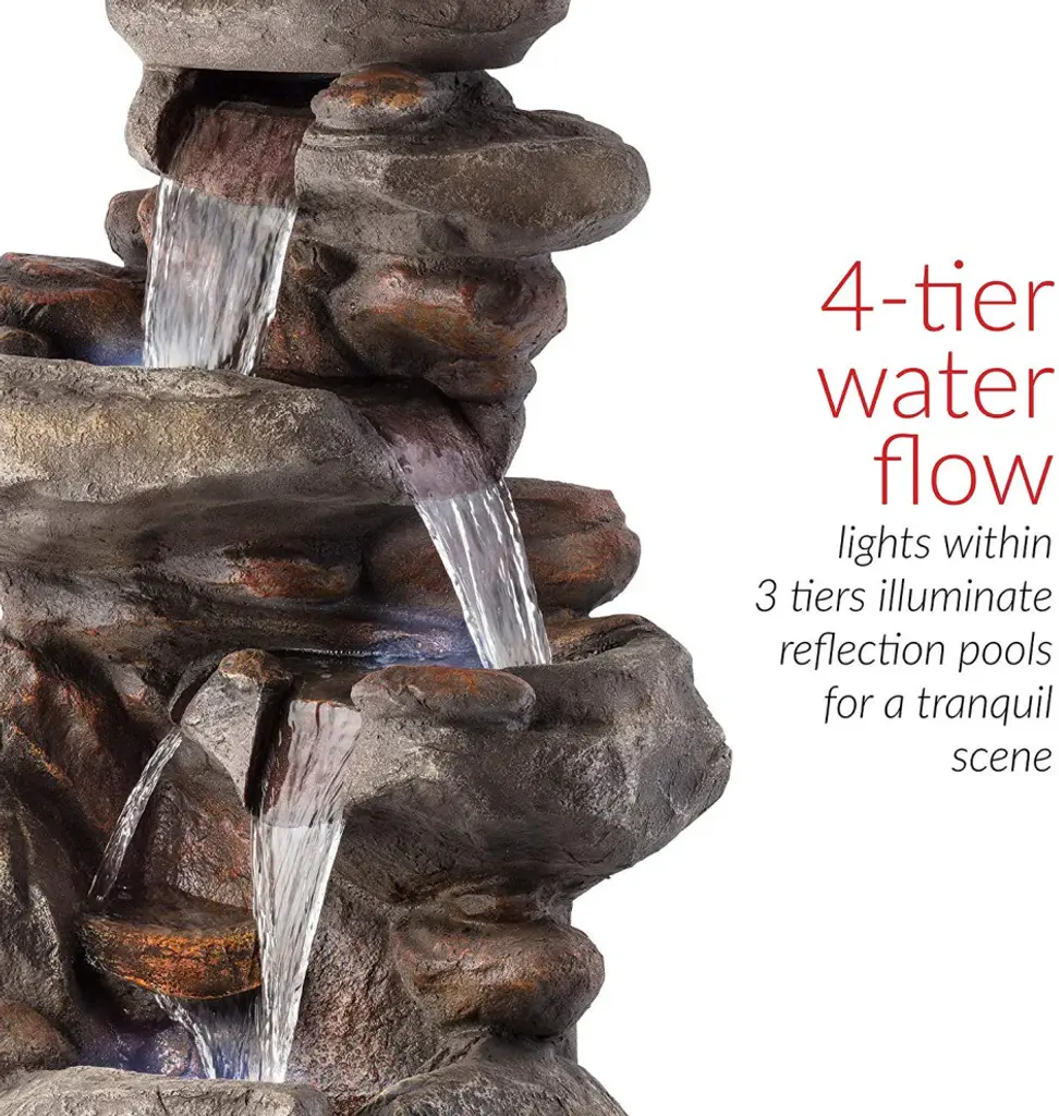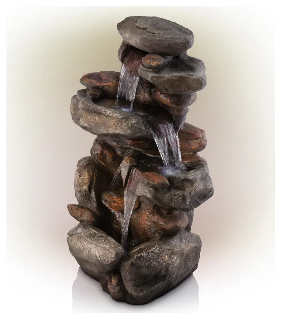 Relax and enjoy the sounds of nature with the Alpine Corporation 4-Tier Rock Fountain! You will feel like you are sitting next to a majestic mountain stream in the great outdoors all while relaxing in your own backyard. This outdoor fountain looks great in your garden, patio, deck, porch, or yard space. Take in the tranquil sounds of the water gently cascading over natural-looking gray stone. The polystone and fiberglass construction is weatherproof, rust-resistant, and durable for years of quality use. The three LED lights in the fountain''s tiers accent the movement of the trickling water for a subtle yet beautiful light source, day or night. To use, simply attach the pump to the hose, plug it into an outdoor outlet, fill the lower level with water, and watch as the interior pump creates a lovely water flow reminiscent of a lush rainforest. With a 1-year warranty, you can be confident in the quality of your purchase. Fountain measures 23"L x 18"W x 40"H for use in any indoor or outdoor setting. Alpine Corporation is one of America''s leading designers, importers, and distributors of superior quality home and garden decor products. Alpine Corporation''s award winning in-house design team continuously develops new and innovative "statement pieces" for your home and garden. Your indoor and outdoor living spaces will be the envy of the neighborhood with our wide assortment of fresh, fashionable and contemporary products, from beautifully crafted solar garden stakes featuring patented motion and fiber optic lighting technology to beautiful fountains and delightful bird baths and feeders.