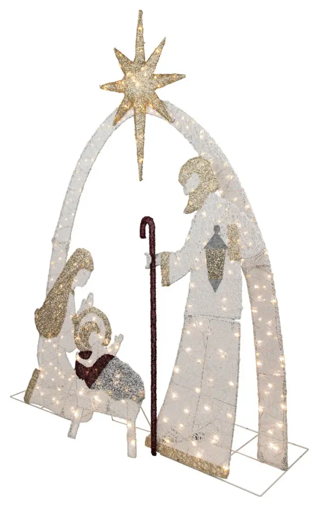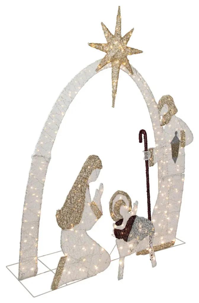 Bring the true spirit of Christmas to your outdoor decor with the stunning commercial size LED Lighted Holy family nativity scene. This beautiful and durable decoration is perfect for adding warmth to your outdoor space. The scene features the Holy Family - Mary Joseph and Baby Jesus basking in a warm LED glow. With easy assembly and high-quality construction this nativity scene will be a cherished part of your holiday decorations for years to come.Product Features:Pre-lit with 280 warm white lightsBulb size: micro fairyBulb type: LED16'' clear lead wireAdditional product features:LED lights use 90% less energyLights stay cool to the touchSome assembly required14 ground stakes and 20 cable ties includedLights are UL approved and certified for indoor or outdoor useAdapter: UL 4.5V 6WDimensions: 41"H x 36"W x 8"D (height includes star)Material(s): metal/plastic/wire/fabric