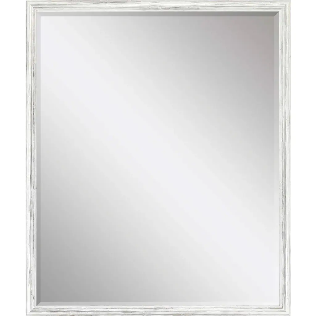 Elegant beveled mirror is framed in a whitewash distressed wood with ribbed face.