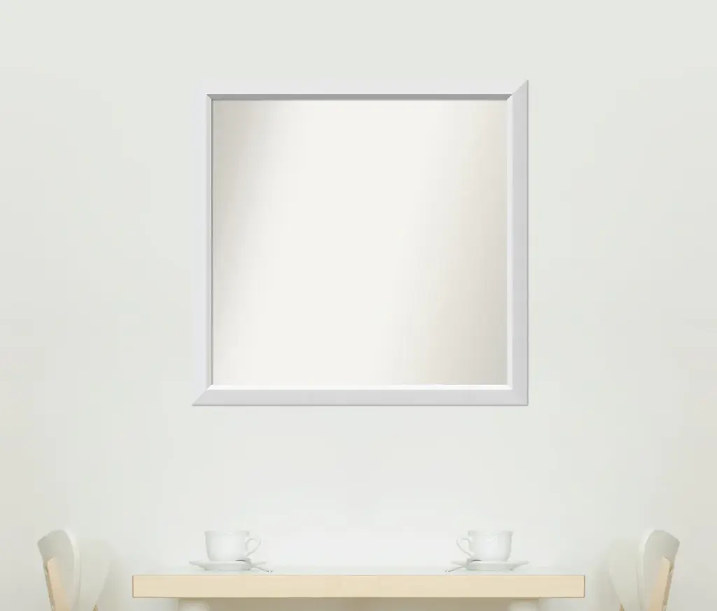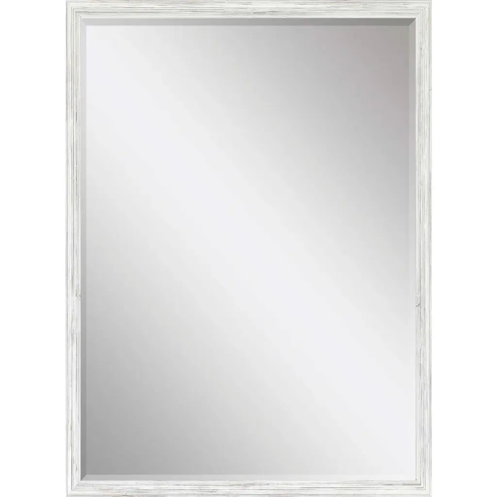 Elegant beveled mirror is framed in a whitewash distressed wood with ribbed face.