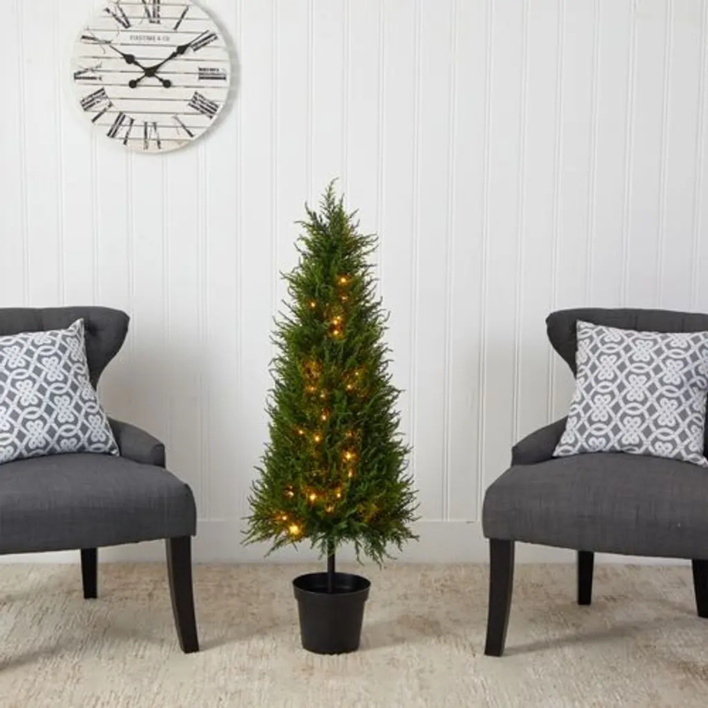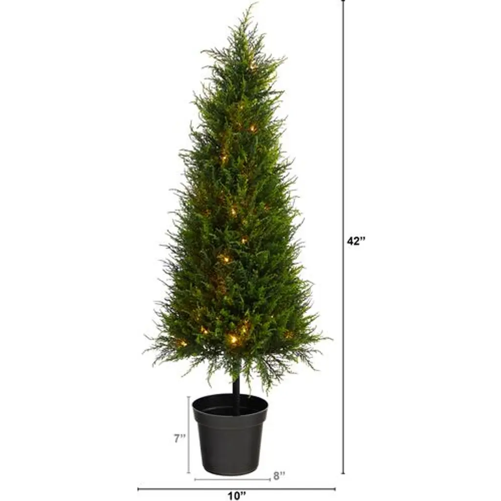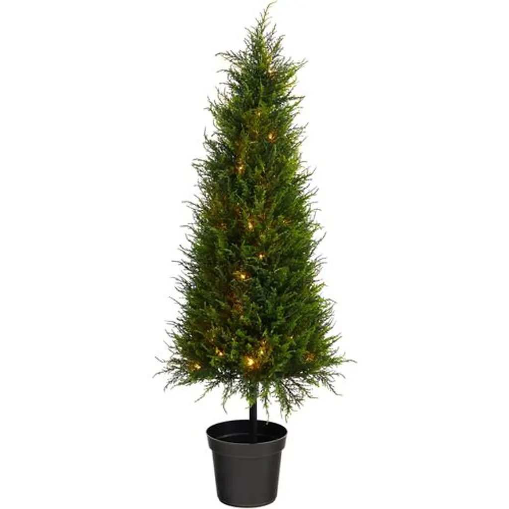 Light up your porch, patio, or entry with this impeccably lifelike faux cypress tree adorned with 350 petite LED lights. Standing three-and-a-half feet high, the tree comes with three AA batteries and is suitable for use outdoors or in.