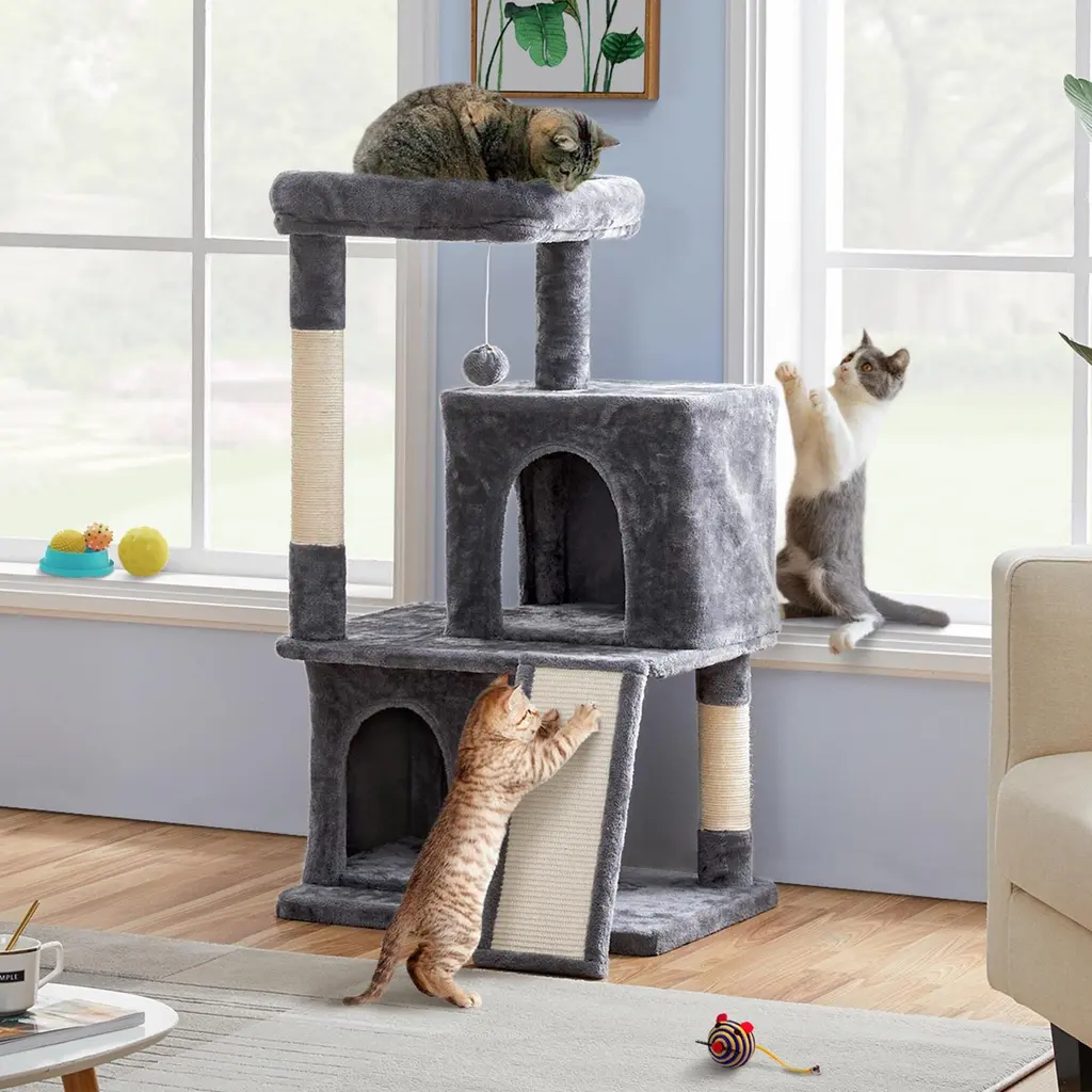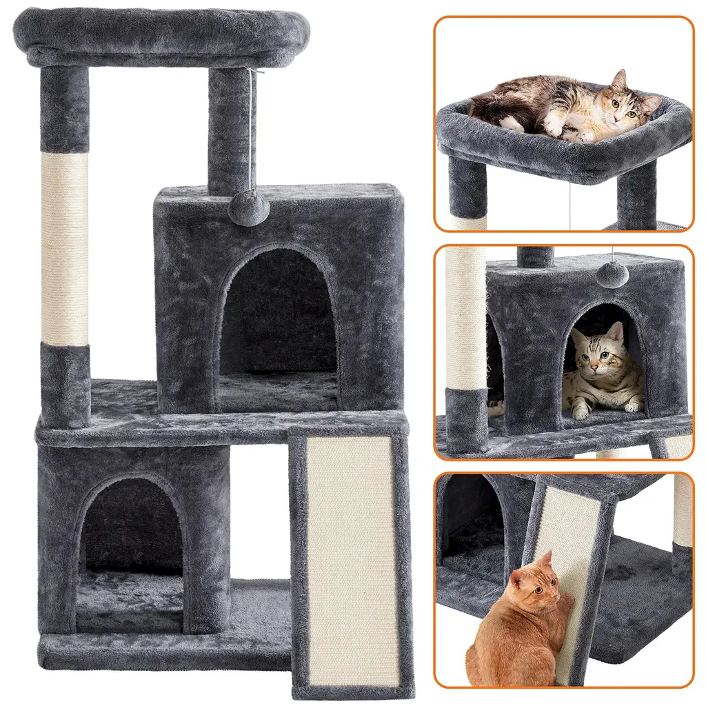 MULTI-LEVEL: Our plush cat house has a high edged perch with a furry ball, two condos with two doors individually, two scratching posts, and one lower scratching board. The whole structure has 3 tiers. Our multi-level cat tower will bring comfort and fun to your adorable cats STURDY & COZY: This 3-tier cat tree is made from particleboard, plush, sisal ropes, metal, paper tubes, and plastic. The selected materials are sturdy and cozy enough for cats sleeping and playing. This plush cat tree is generally suitable for 2-3 small or medium-sized cats SAFE TO USE: To ensure safety, the corners of the bottom board, middle board, perch and condos all are round in shape to protect your cats from hurting SCRATCHING POSTS & BOARD: This multi-level cat tower has 2 scratching posts and a scratching board evenly distributed around the tower. The scratching posts & board are covered by natural sisal ropes. They are not only for your kittens' fun, but also protect your furniture from their paws EASY-TO-MATCH: The whole cat tree is covered by plush in a simple color. It is easy to match other furniture and becomes a special beauty to your house.